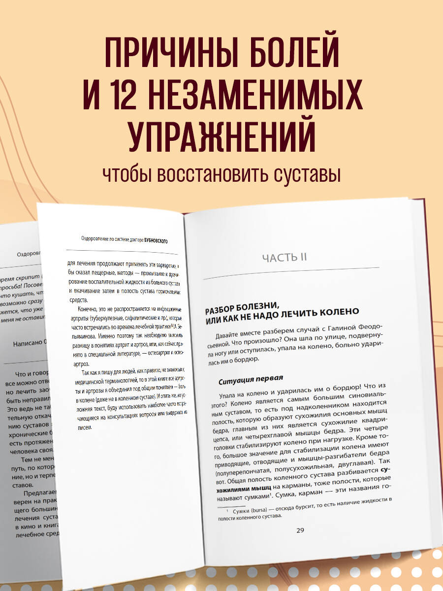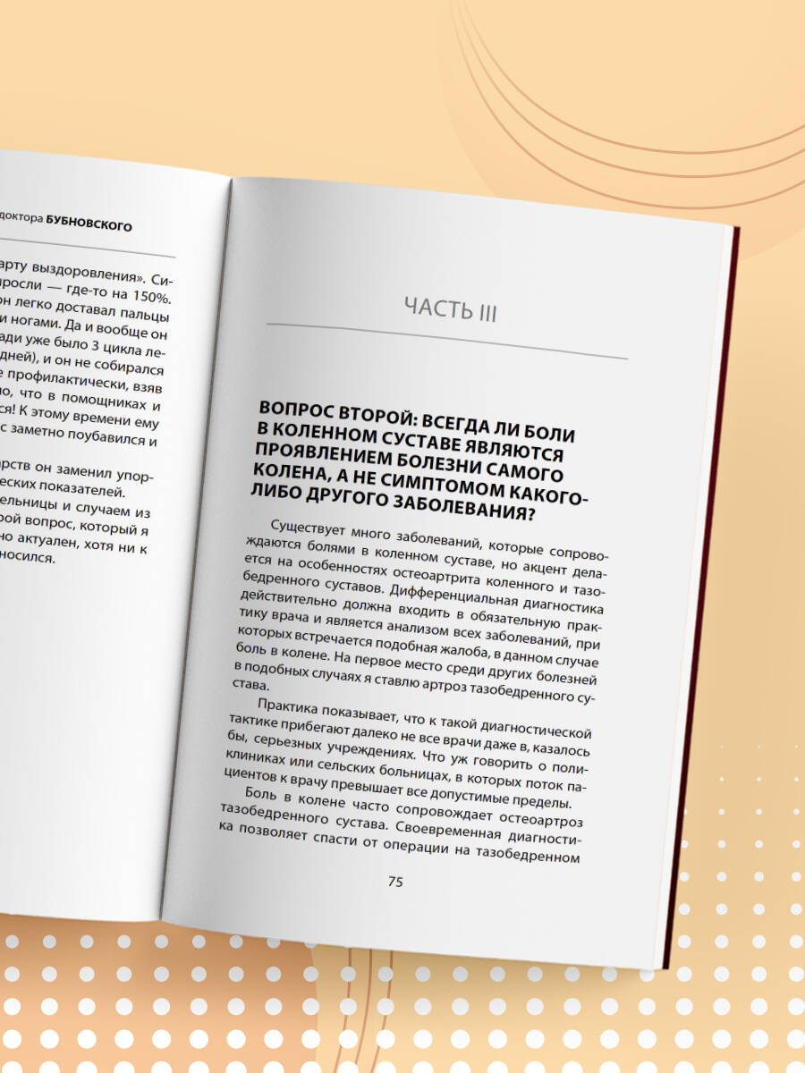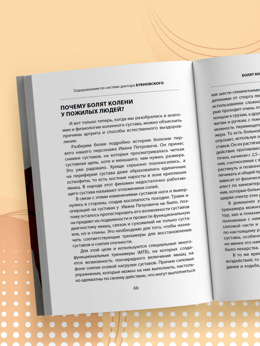 Лидер продаж! В книге «Болят колени. Что делать?» доктор Бубновский подробно описал лечение артритов и артрозов коленного сустава, восстановление после травмы и операций, также даны специально разработанные автором упражнения. Благодаря реабилитации по авторской методике доктора Бубновского пациенты после травм коленей и сложных операций выигрывают золотые медали на Олимпийских играх, чемпионатах Европы и мира, а люди, далекие от спорта, даже после 70-ти, забывают про костыли и перестают хромать! Книга продана тиражом 322 000 экземпляров.