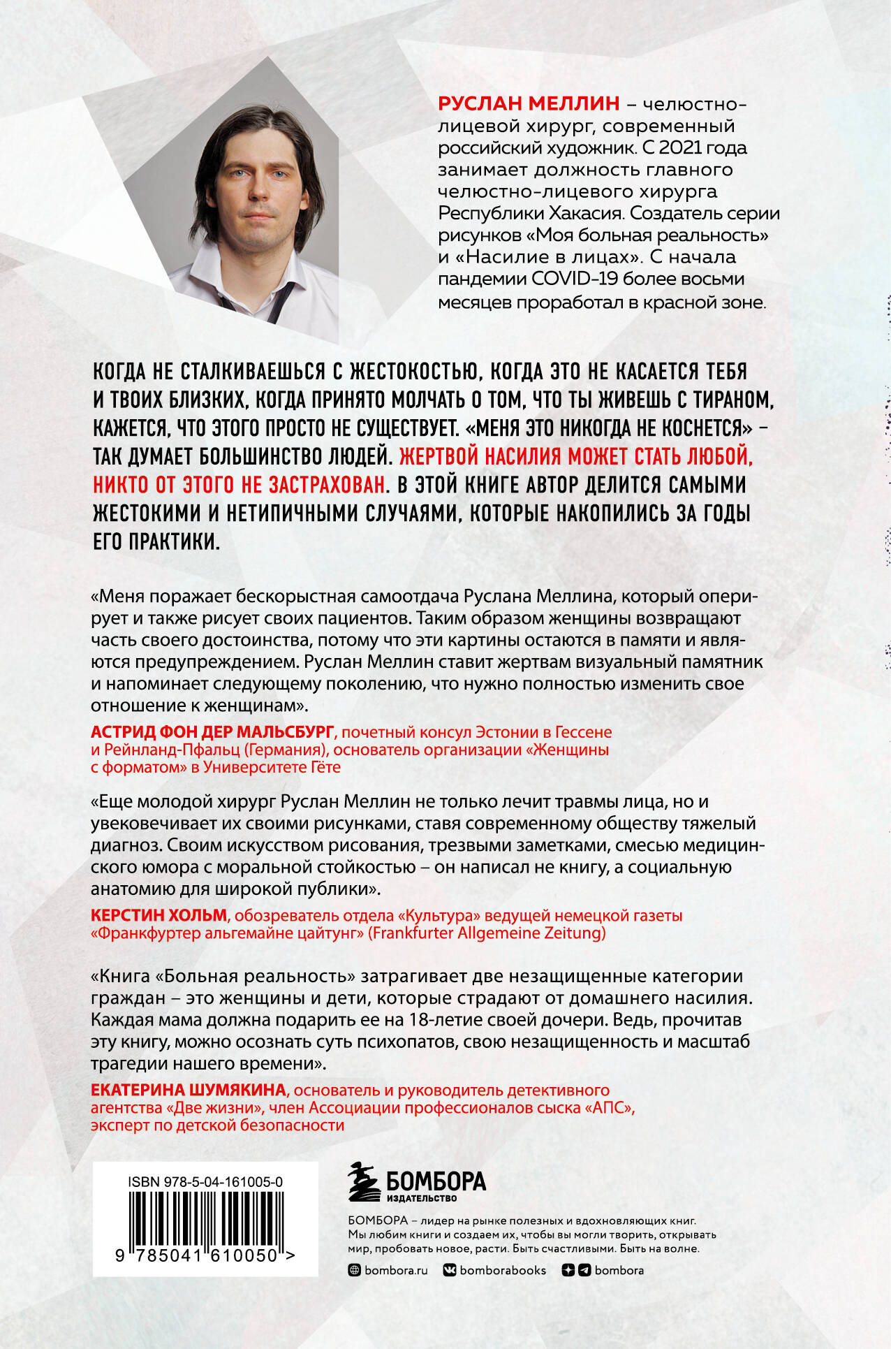 Каждая иллюстрация в этой книге - отпечаток чьей-то травмы, и за каждой из них стоит реальная история о жертве насилия. Все они нарисованы талантливым художником и врачом-хирургом Русланом Меллиным, который за свою медицинскую практику оперировал множество людей, пострадавших из-за чужой жестокости. Серьезные переломы челюстей, порезы, ушибы, раны от топора - автор книги сталкивался с шокирующими и нетипичными случаями, а пациенты, попадавшие в его кабинет, были изувечены не только физически, но и психологически. Кто-то из-за страха и стыда не решался рассказать правду о случившемся. Кто-то пытался оправдать агрессора. Кто-то просто замыкался в себе. Всех героев мы видим уже в финалах их историй: после сложных операций и долгого восстановления. - Что ждет их, когда они покинут стены больницы? - Почему в счастливых, на первый взгляд, семьях царит такая бесчеловечность? - Как люди допускают такое отношение к себе? Книга «Больная реальность» - попытка врача, ежедневно сталкивающегося с чужой болью, ответить на эти непростые вопросы. «Женщины продолжают становиться жертвами домашнего насилия и получают ужасные телесные и психические травмы. Часто преступники остаются безнаказанными, и эту несправедливость невозможно терпеть. Меня поражает бескорыстная самоотдача врача-хирурга Руслана Меллина, который оперирует и также рисует своих пациентов. Таким образом женщины возвращают часть своего достоинства, потому что эти картины остаются в памяти и являются предупреждением. Руслан Меллин ставит жертвам визуальный памятник и напоминает следующему поколению, что нужно полностью изменить свое отношение к женщинам». - АСТРИД ФОН ДЕР МАЛЬСБУРГ, почетный консул Эстонии в Гессене и Рейнланд-Пфальц (Германия), основатель организации «Женщины с форматом» в Университете Гёте «Еще молодой хирург Руслан Меллин не только лечит травмы лица, но и увековечивает их своими рисунками, ставя современному обществу тяжелый диагноз. Своим искусством рисования, трезвыми заметками, смесью медицинского юмора с моральной стойкостью - он создал не книгу, а социальную анатомию для широкой публики. Она поможет жертвам насилия и привьет новому поколению здоровую реакцию на описанные случаи». - КЕРСТИН ХОЛЬМ, обозреватель отдела «Культура» ведущей немецкой газеты «Франкфуртер альгемайне цайтунг» (Frankfurter Allgemeine Zeitung) «Книга "Больная реальность" затрагивает две незащищенные категории граждан - это женщины и дети, которые страдают от домашнего насилия. Прочитав ее, можно осознать суть психопатов, свою незащищенность и масштаб трагедии нашего времени». - ЕКАТЕРИНА ШУМЯКИНА, основатель и руководитель детективного агентства «Две жизни», член Ассоциации профессионалов сыска «АПС», эксперт по детской безопасности ЭТУ КНИГУ СТОИТ ПРОЧИТАТЬ, ЧТОБЫ: - узнать о темной стороне общества, которую видят только врачи, оперируя ужасные раны; - принять самое важное решение в своей жизни: уйти от тирана; - вовремя распознать, что в семье близкого человека происходит что-то неладное, и принять меры; - если вы столкнулись с насилием, то понять, что вы не одиноки, и перестать себя винить во всем или стыдиться этого; - узнать, на какие жестокости способен человек и как себя вовремя оградить от этого; - начать ценить свою жизнь еще больше, если вы никогда ранее не сталкивались с насилием.| И