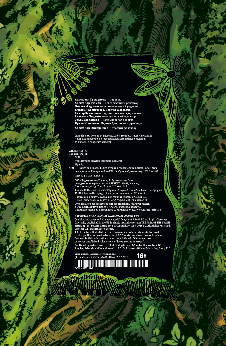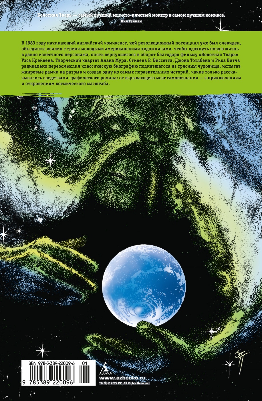 В 1983 году начинающий английский комиксист, чей революционный потенциал уже был очевиден, объединил усилия с тремя молодыми американскими художниками, чтобы вдохнуть новую жизнь в давно известного персонажа, опять вернувшегося в оборот благодаря фильму «Болотная Тварь» Уэса Крейвена. Творческий квартет Алана Мура, Стивена Р. Биссетта, Джона Тотлбена и Рика Витча радикально переосмыслил классическую биографию поднявшегося из трясины чудовища, испытав жанровые рамки на разрыв и создав одну из самых поразительных историй, какие только рассказывались средствами графического романа: от взрывающего мозг самопознания - к приключениям и откровениям космического масштаба.