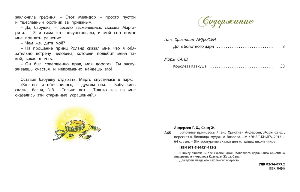 Принцессы бывают разными - красивыми и не очень, умными и дурочками, богатыми и почти нищенками. И встретить их можно в самых разных местах: во дворце и в бедной хижине, на городской площади и в придорожном трактире, в лесу и на болоте…Вот как раз таким, которые живут на болоте, и посвящена эта книга. В нее вошли две сказки: «Дочь болотного царя» Ганса Христиана Андерсена и «Королева Квакуша» Жорж Санд.