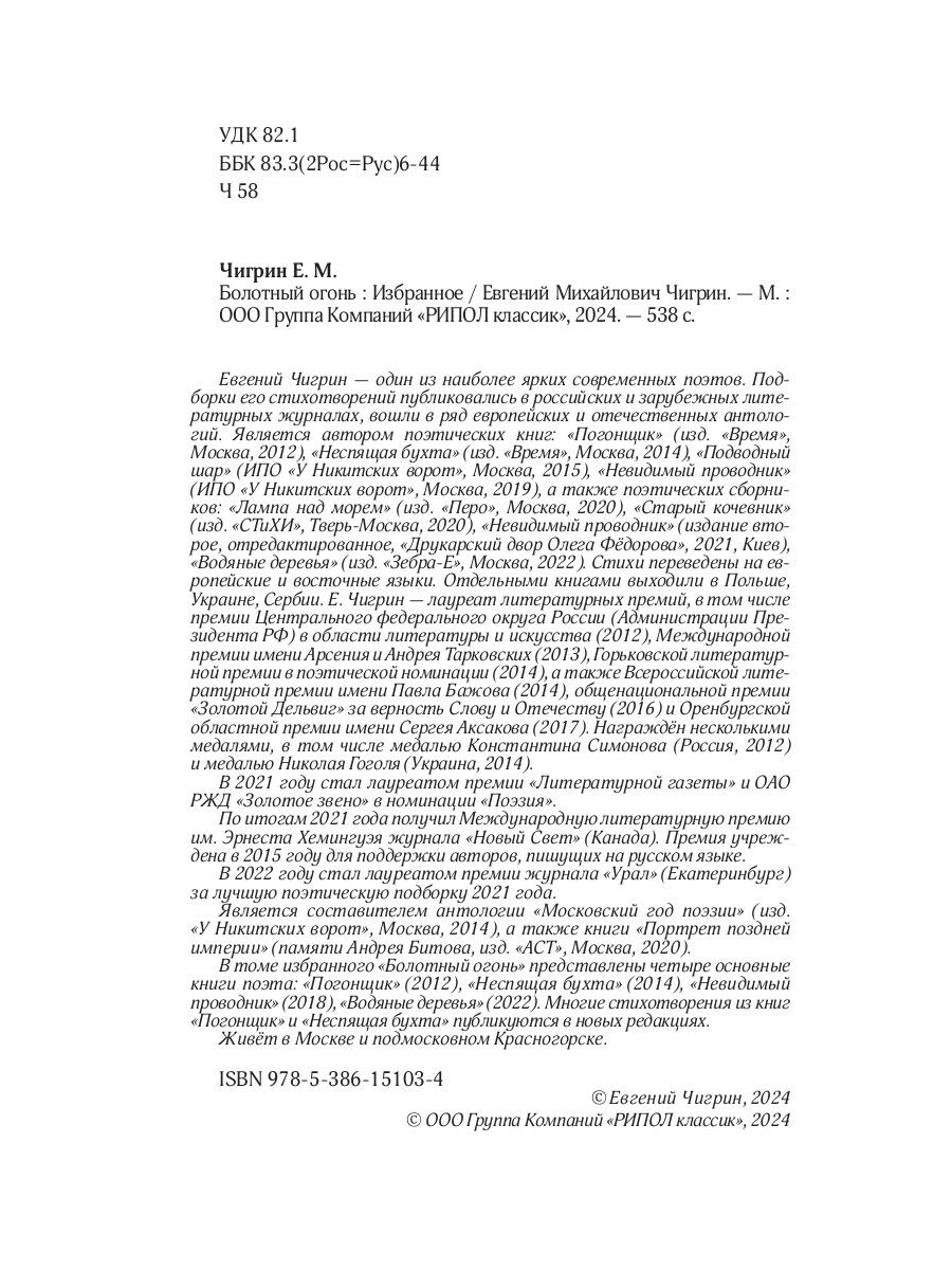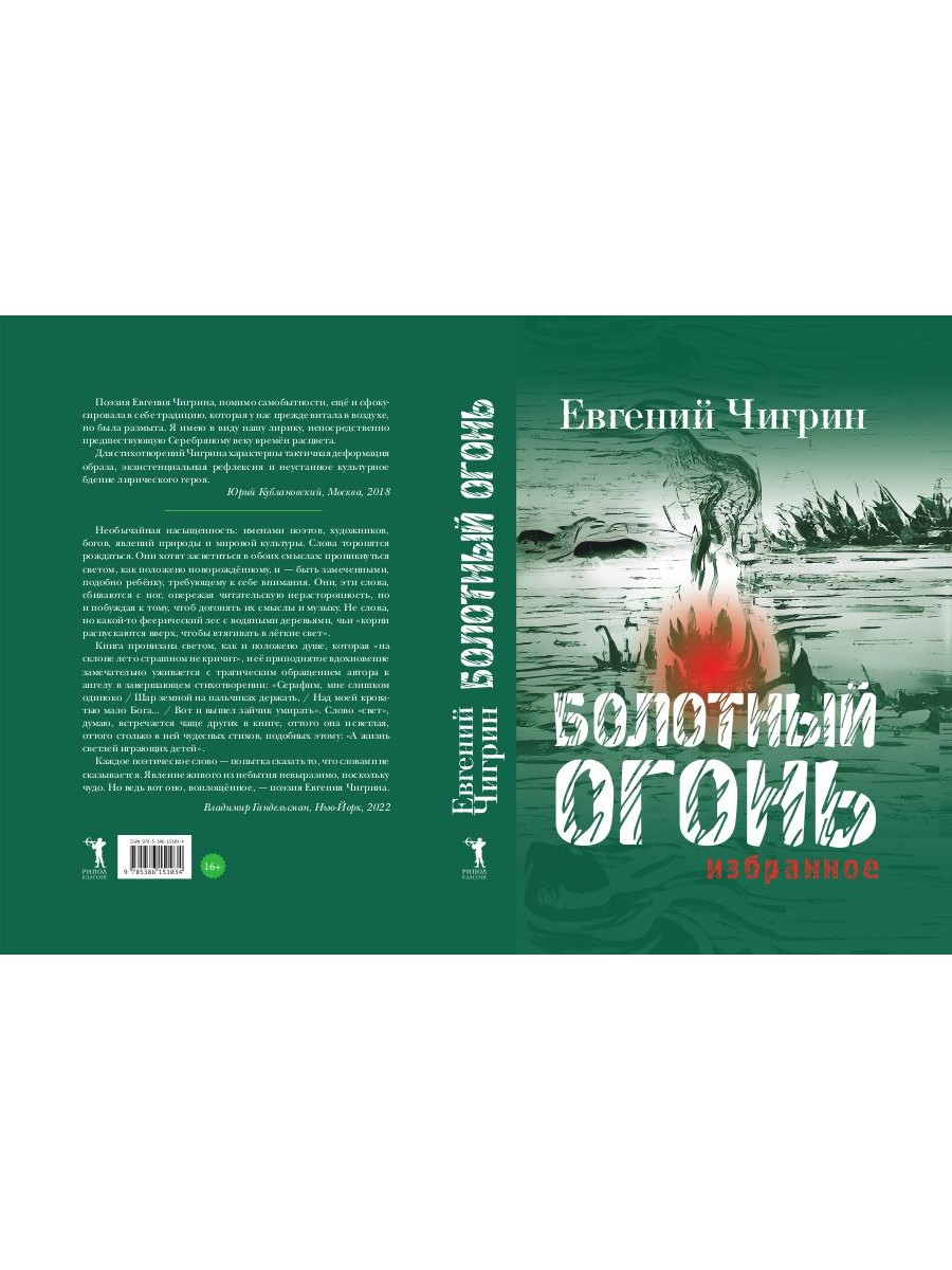 Евгений Чигрин - один из наиболее ярких современных поэтов. Подборки его стихотворений публиковались в российских и зарубежных литературных журналах, вошли в ряд европейских и отечественных антологий. Является автором поэтических книг: «Погонщик» (изд. «Время», Москва, 2012), «Неспящая бухта» (изд. «Время», Москва, 2014), «Подводный шар» (ИПО «У Никитских ворот», Москва, 2015), «Невидимый проводник» (ИПО «У Никитских ворот», Москва, 2019), а также поэтических сборников: «Лампа над морем» (изд. «Перо», Москва, 2020), «Старый кочевник» (изд. «СТиХИ», Тверь-Москва, 2020), «Невидимый проводник» (издание второе, отредактированное, «Друкарский двор Олега Фёдорова», 2021, Киев), «Водяные деревья» (изд. «Зебра-Е», Москва, 2022). Стихи переведены на европейские и восточные языки. Отдельными книгами выходили в Польше, Украине, Сербии. Е. Чигрин - лауреат литературных премий, в том числе премии Центрального федерального округа России (Администрации Президента РФ) в области литературы и искусства (2012), Международной премии имени Арсения и Андрея Тарковских (2013), Горьковской литературной премии в поэтической номинации (2014), а также Всероссийской литературной премии имени Павла Бажова (2014), общенациональной премии «Золотой Дельвиг» за верность Слову и Отечеству (2016) и Оренбургской областной премии имени Сергея Аксакова (2017). Награждён несколькими медалями, в том числе медалью Константина Симонова (Россия, 2012) и медалью Николая Гоголя (Украина, 2014). В томе избранного «Болотный огонь» представлены четыре основные книги поэта: «Погонщик» (2012), «Неспящая бухта» (2014), «Невидимый проводник» (2018), «Водяные деревья» (2022). Многие стихотворения из книг «Погонщик» и «Неспящая бухта» публикуются в новых редакциях.| Издательство | Рипол Классик |