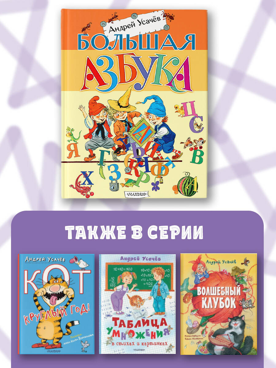 Все писатели немножко волшебники. Ведь из 33 букв у них получаются прекрасные детские книжки. У Андрея Усачёва получилось очень много великолепных книг. Хотите их все прочитать? Чтобы это сделать, нужно знать буквы. Андрей Усачёв специально для самых маленьких детей написал эту книгу про буквы - «Большая азбука». Скорее открывайте вместе с малышами эту книгу, учите вместе с ними алфавит, а потом малыши уже сами смогут её прочесть и тоже стать волшебниками, как и заклинатель букв Андрей Усачёв!| Издательство | Издательство "АСТ" |