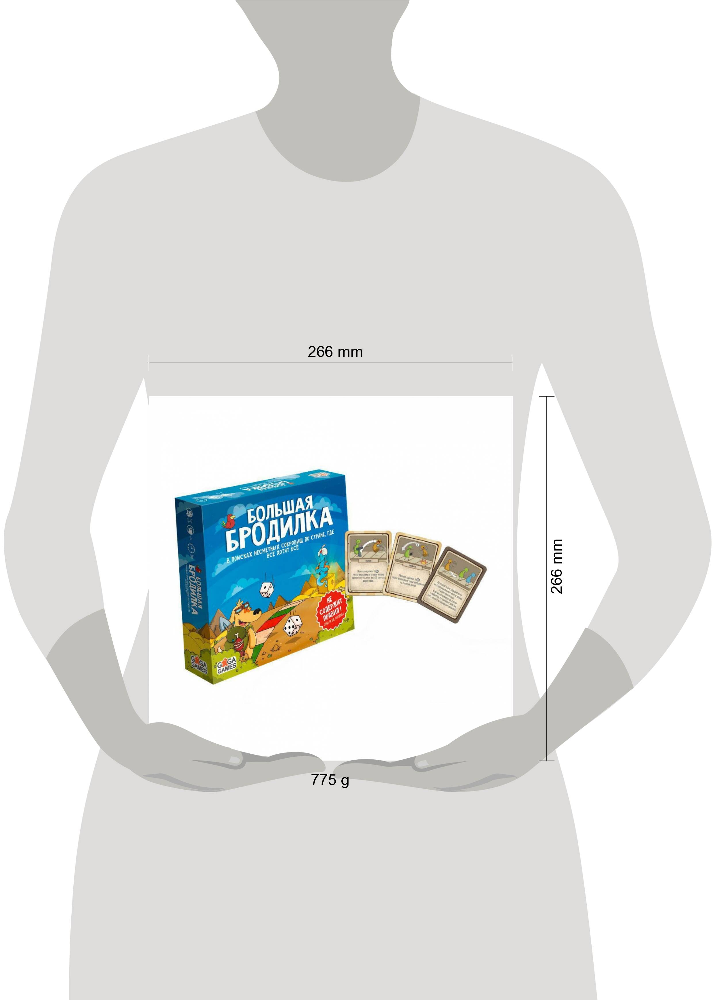 Большая Бродилка - игра для тех, кто устал от сложных правил и соскучился по любимому с детства развлечению. Она проста, как два кубика, и увлекательна, как путешествия во времени. Или как коробка шоколадных конфет: начнешь - и... дальше " уже не остановиться. Думаете, что бродилки с кубиком и полем годятся разве что для детей и начинающих настольщиков? Эта Большая Бродилка изменит ваше представление о жанре! В ней есть телепорты, гарпуны, лавки и прочие удивительные вещи, которые помогут не просто положиться на судьбу, бросая кости, но повлиять на исход всего путешествия. Удачный бросок кубиков отправляет вас в телепорт. Вы вырываетесь на 10 клеток вперед. Теперь уже никому вас не догнать! Но не тут-то было: противник заглядывает в Лавку Джо, и из-за одной-единственной карты ваш храбрый персонаж возвращается на 8 клеток назад. Так нечестно! Ну, держитесь… Правил в игре нет (они вам и не понадобятся), зато есть настоящий свод законов, который ответит на все вопросы. Выбирайте себе персонажа по душе - харизматичного пёсика или, например, вооруженную до зубов путешественницу - и отправляйтесь в путь! Ваша задача - добраться до финиша и заполучить сокровища злобного джинна, выкинув на кубиках 6. По дороге придется полагаться на собственную удачу, подставлять соперников, воровать монеты - одним словом, быть настоящим искателем приключений. В пути подстерегают как опасности и ловушки, так и необычайное везение. Коварные порталы, которые могут сэкономить время или отправить на полкарты назад. Проклятая шахта, которая может надолго задержать или подать победу на блюдечке. Карты Тадам, меняющие правила игры буквально на ходу. Играть одинаково весело и в компании побольше, и даже вдвоем. А крутая мультяшная рисовка Бродилки - дело рук петербургского художника-комиксиста Владимира Лопатина. Веселые иллюстрации, полное отсутствие правил и азартная механика превращают Большую Бродилку в любимицу всех возрастов и поколений. Отличная игра, которая подойдет как для уютного семейного вечера, так и для веселой компании друзей. В наборе: игровое поле, 59 карт, 90 жетонов монет, 5 персонажей, 5 подставок под персонажей, 2 кубика, свод законов.