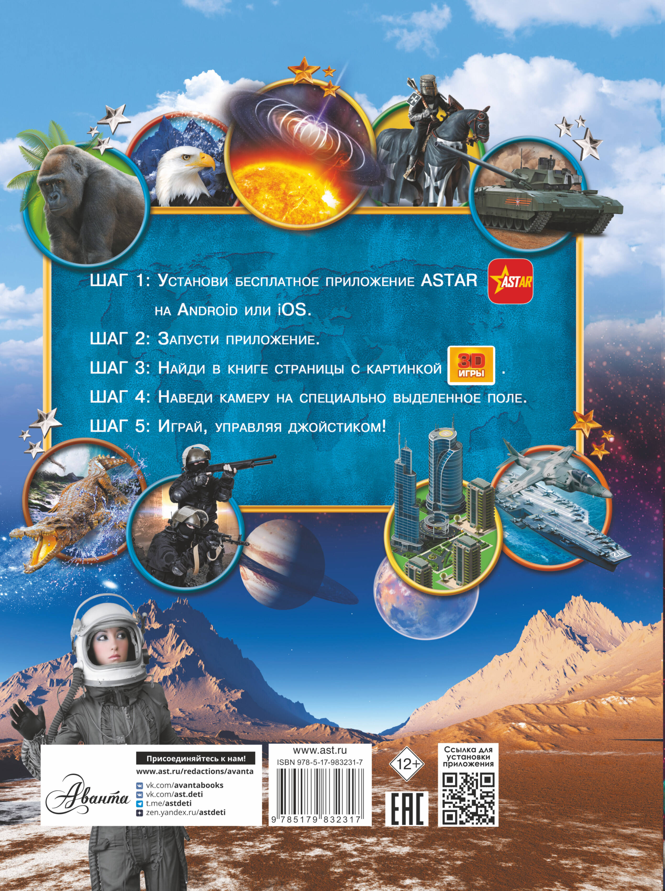 Ты растешь и огромный мир постепенно раскрывает перед тобой свои тайны. Но так хочется узнать все сразу и обо всем на свете! Так в чем же дело? Открой страницы нашей уникальной гигантской энциклопедии, и у тебя появится уникальная возможность познать тайны Вселенной, получше познакомиться с нашей родной планетой, ее доисторическими и современными обитателями, и разными видами техники - делом рук человеческих. Обо всем этом ты сможешь не только прочесть или рассмотреть на наших ярких красочных иллюстрациях, но и увидеть ответы на свои вопросы в объеме и движении. Понаблюдать за движением планет по орбитам и восхититься полярным сиянием, увидеть, как кит выпускает фонтан воды в небеса и поучаствовать в захватывающем сражении - это, и многое другое станет доступно тебе с нашей гигантской 3Д -энциклопедией с дополненной реальностью. И всеми этими неожиданными возможностями будешь командовать ты сам. Как это возможно? Открой заинтересовавшую тебя страницу энциклопедии, направь на нее смартфон или планшет с установленным бесплатным мобильным приложением ASTAR, - и перед тобой развернутся небывалые возможности дополненной реальности. Наша уникальная детская энциклопедия не только поделится с тобой новыми знаниями, но и доставит немало захватывающих дух переживаний. Открой эту книгу - и тебе откроются тайны мироздания. Поверь - скучно не будет!| Издательство | Издательство "АСТ" |