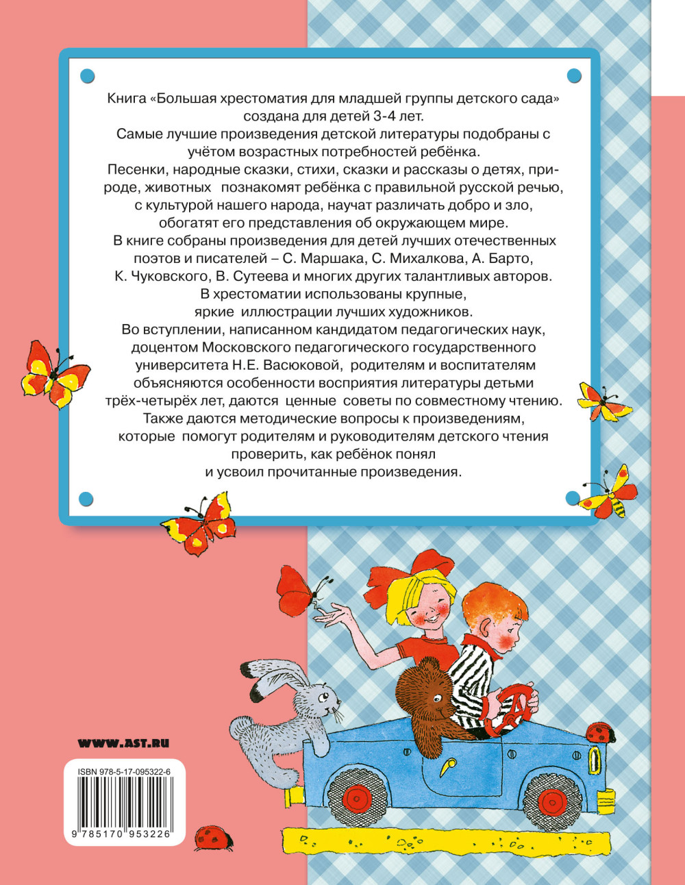 Книга «Большая хрестоматия для младшей группы детского сада» создана для детей 3-4 лет. Самые лучшие произведения детской литературы подобраны с учётом возрастных потребностей ребёнка. Песенки, народные сказки, стихи, сказки и рассказы о детях, природе, животных познакомят ребёнка с правильной русской речью, с культурой нашего народа, научат различать добро и зло, обогатят его представления об окружающем мире. В книге собраны произведения для детей лучших отечественных поэтов и писателей - С. Маршака, С. Михалкова, А. Барто, К. Чуковского, В. Сутеева и многих других талантливых авторов. В хрестоматии использованы крупные, яркие иллюстрации лучших художников. Во вступлении, написанном кандидатом педагогических наук, доцентом Московского педагогического государственного университета Н.Е. Васюковой, родителям и воспитателям объясняются особенности восприятия литературы детьми трёх-четырёх лет, даются ценные советы по совместному чтению. Также даются методические вопросы к произведениям, которые помогут родителям и руководителям детского чтения проверить, как ребёнок понял и усвоил прочитанные произведения.