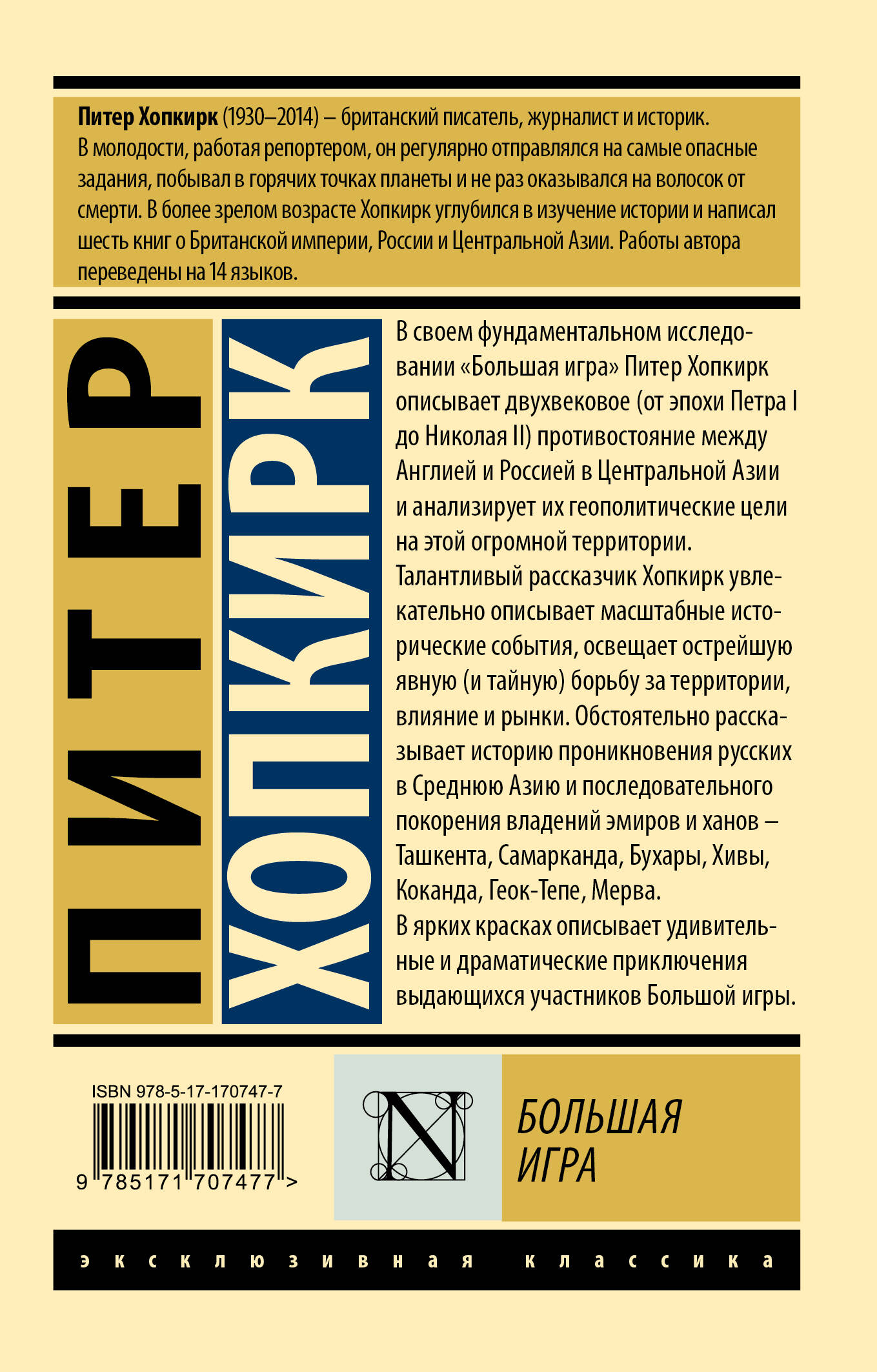 - Классика исторической мысли. - Питер Хопкирк - британский журналист, писатель и историк, специализирующийся на истории Британской империи и Центральной Азии. - «Большая игра» - фундаментальное исследование противостояния между Англией и Россией в Центральной Азии, увлекательный рассказ о двух веках шпионажа, авантюр и приключений. - Издание в серии «Эксклюзивная классика» - в удобном формате и узнаваемом оформлении.| Издательство | Издательство "АСТ" |