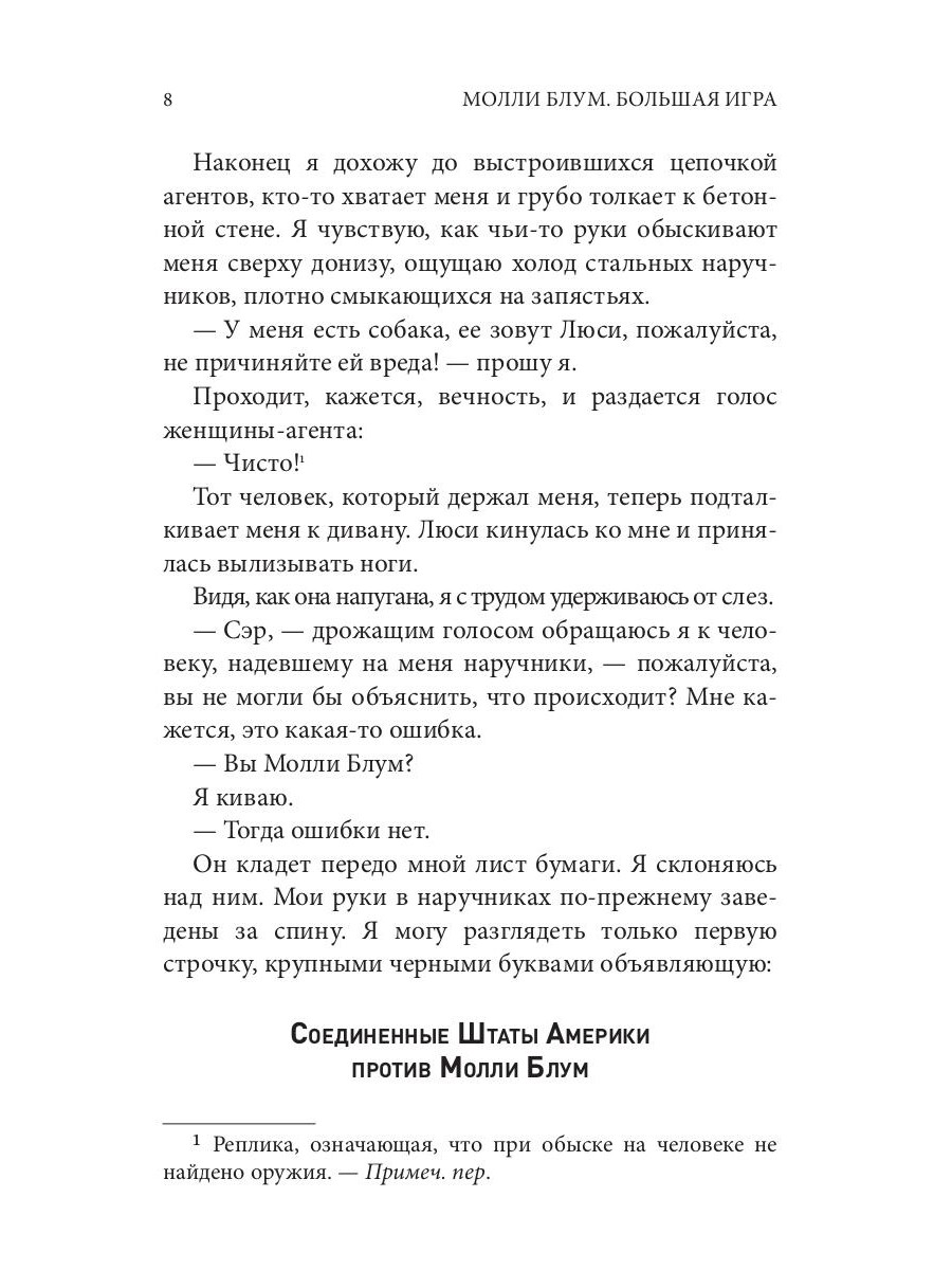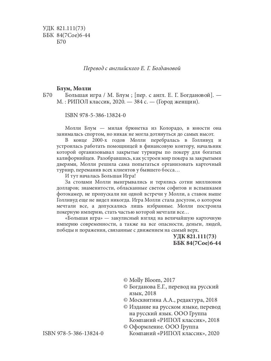 Молли Блум - милая брюнетка из Колорадо, в юности она занималась спортом, но никак не могла дотянуться до самых высот. В конце 2000-х годов Молли перебралась в Голливуд и устроилась работать помощницей в финансовую контору, начальник которой организовывал закрытые турниры по покеру для богатых калифорнийцев. Разобравшись, как устроен мир покера за закрытыми дверями, Молли решила сама попытаться организовать карточный турнир, переманив всех клиентов у бывшего босса... И тут началась Большая Игра! За столами Молли выигрывались и терялись сотни миллионов долларов; знаменитости, обласканные светом софитов и вспышками фотокамер, не пропускали ни одной встречи у Молли, а ставок выше Голливуд еще не видел никогда. Игра Молли стала досугом, о котором мечтали все, а допускались лишь избранные. Молли построила покерную империю, стать частью которой мечтали все... «Большая игра» - закулисный взгляд на величайшую карточную империю современности, а также на все опасности, деньги, людей, победы и поражения, связанные с движением на самый верх.| Издательство | Рипол Классик |