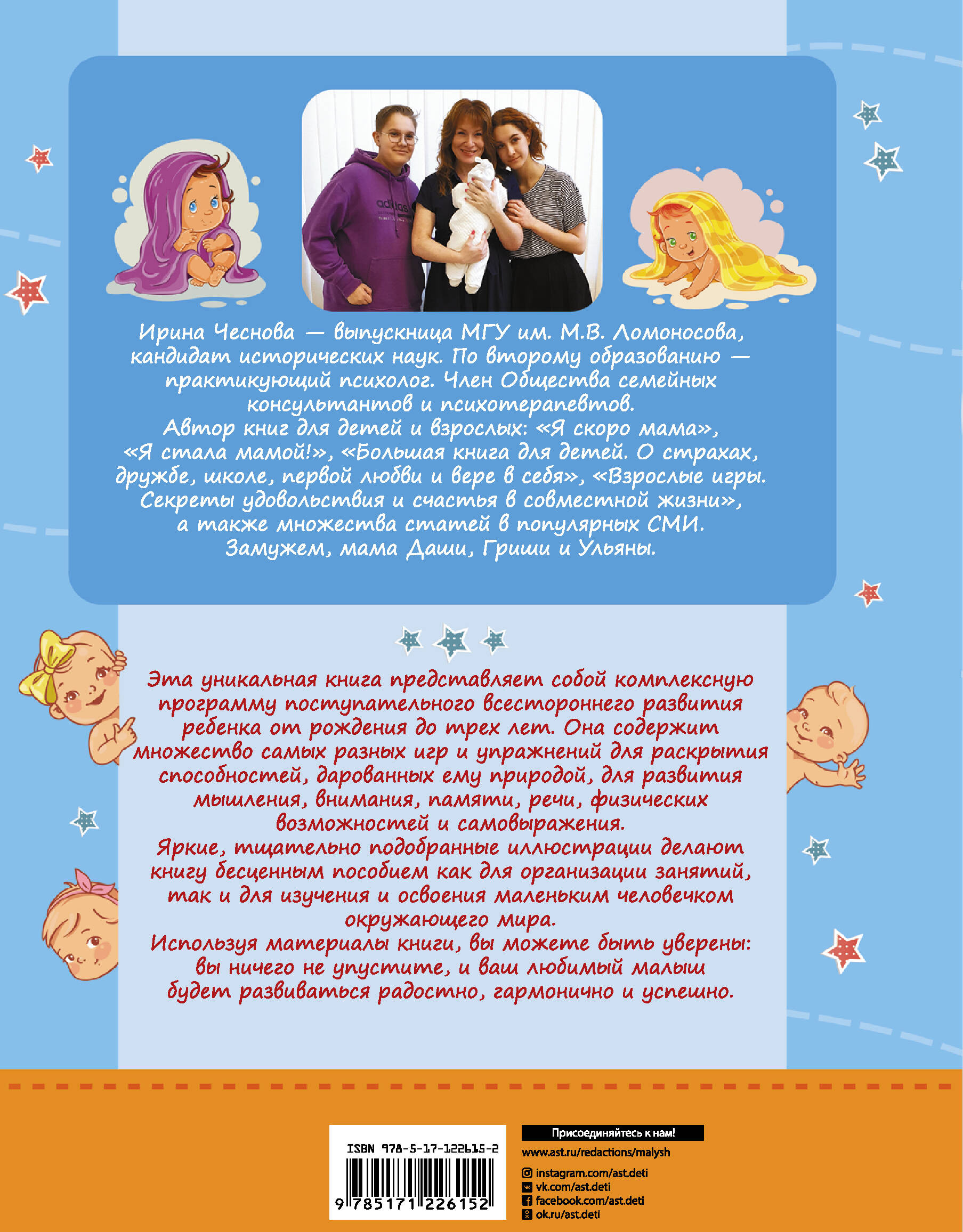 В первые годы жизни мозг маленького человека развивается колоссальными темпами. Важно не упустить момент и создать вокруг ребенка благоприятную среду для его гармоничного взросления и раскрытия способностей, дарованных природой. Книга опытного психолога, члена Общества семейных консультантов и психотерапевтов Ирины Чесновой содержит множество идей, игр и упражнений, которые помогут вам заниматься с малышом с первых дней его жизни и наполнить общение с ним взаимной радостью и удовольствием. Все вместе эти занятия составляют продуманную программу поступательного, комплексного развития ребенка от рождения до трех лет. Они заложат прочный фундамент для формирования хорошей памяти, устойчивого внимания, гибкого мышления и грамотной речи, чтобы малыш рос здоровым, смышленым, уверенным в своих силах и готовым решать сложные задачи, которые встретятся ему в жизни.| Издательство | Издательство "АСТ" |