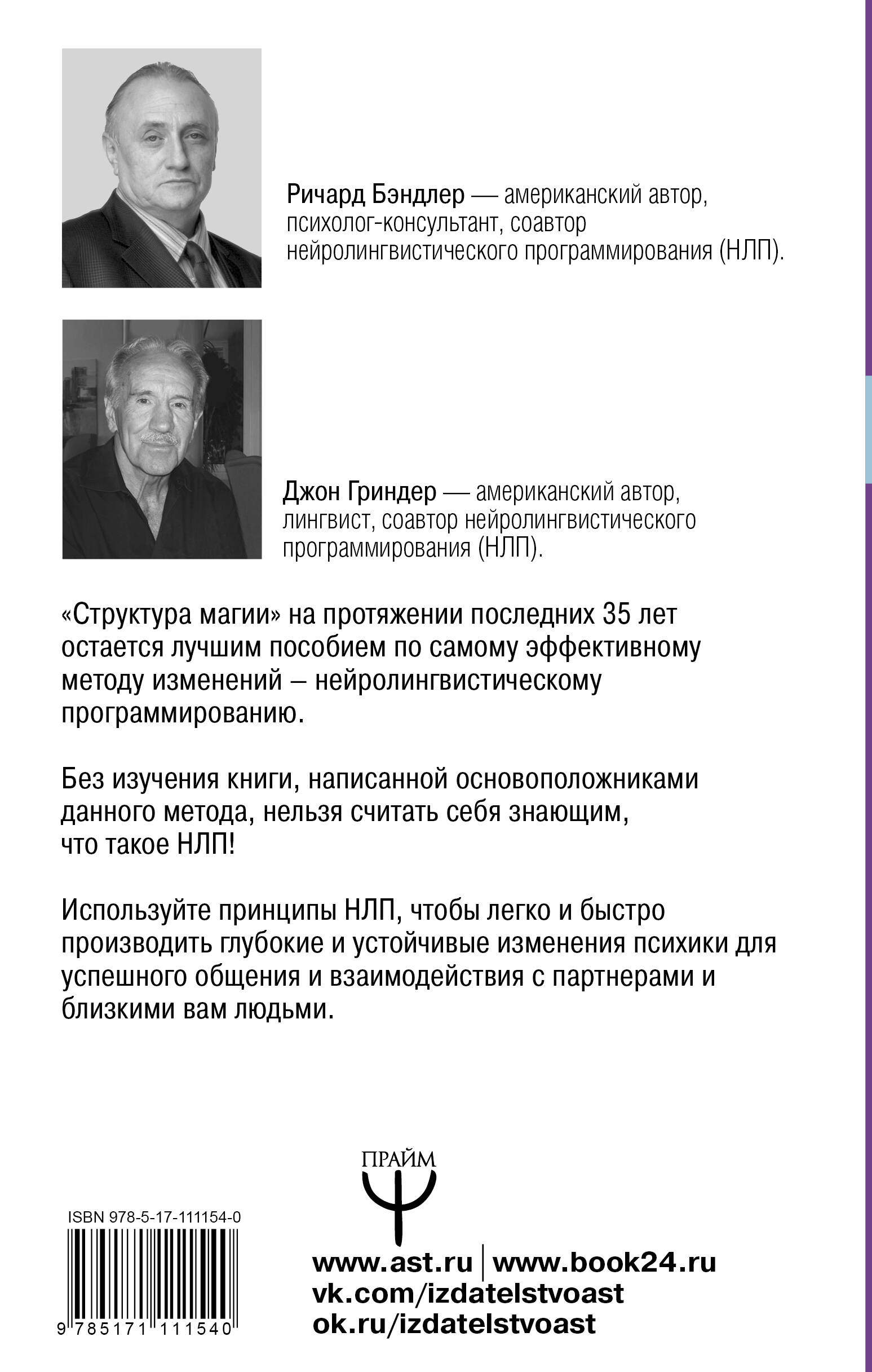 Эта книга на протяжении последних 35 лет безоговорочно рекомендуется любому начинающему или продвинутому консультанту или психотерапевту по самому эффективному методу изменений - нейролингвистическому программированию. Без изучения этой книги нельзя считать себя знающим, что такое НЛП. Используя принципы НЛП, можно описать человеческое поведение таким образом, чтобы легко и быстро производить глубокие и устойчивые изменения. Опираясь на знания, полученные из этой книги, вы сможете стать эффективным коммуникатором, легко и быстро производить глубокие и устойчивые личностные изменения, преодолевать любые психологические ограничения, излечивать фобии, устранять нежелательные привычки и зависимости, производить изменения в отношениях с партнерами и близкими вам людьми.| Издательство | ИЗДАТЕЛЬСТВО "АСТ" |