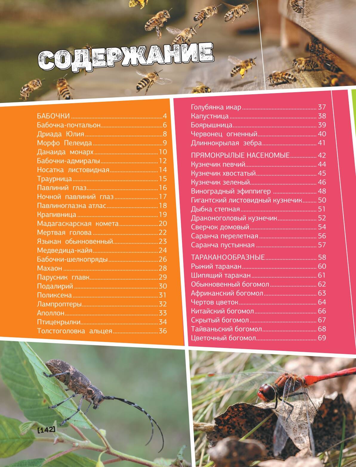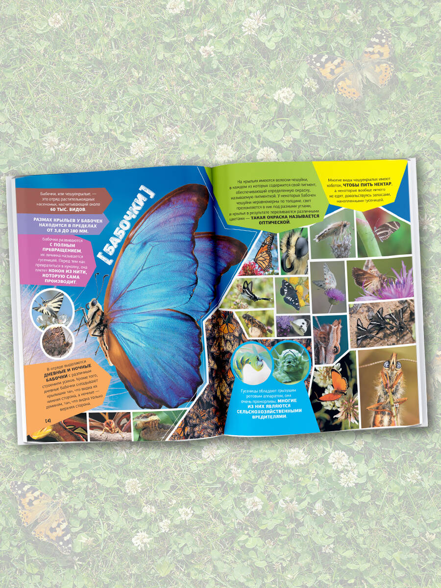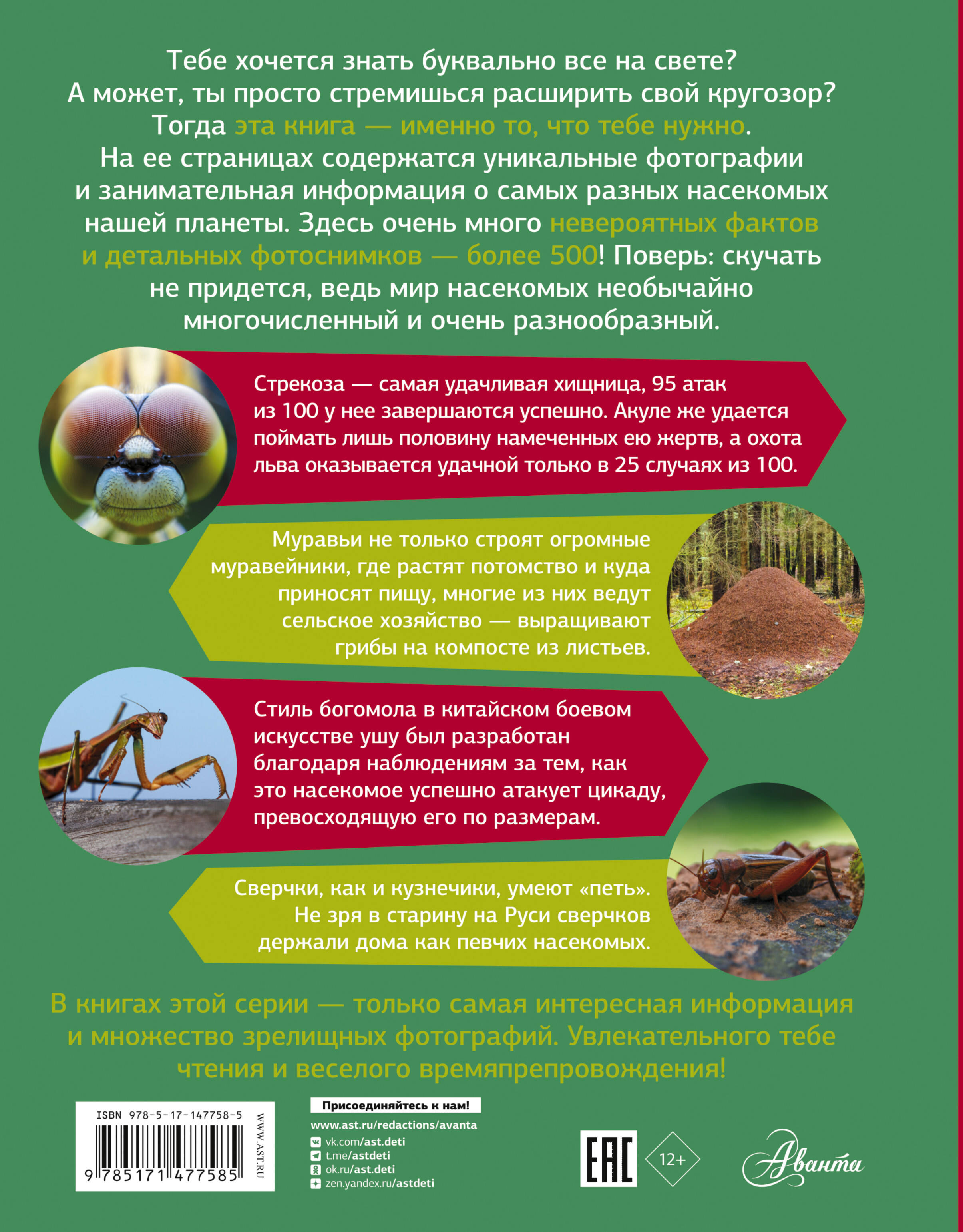 Эта энциклопедия знакомит детей с миром насекомых нашей планеты, но делает это в несколько ином формате, чем другие издания. Здесь нет больших описательных статей и научной классификации - лишь короткие факты и уникальные фотографии бабочек и стрекоз, жуков и кузнечиков, пчел и муравьев, а также известных недругов насекомых - пауков. И несмотря на это, юный читатель получит полное представление о том или ином насекомом, ведь приведенная здесь информация не только интересная, но и вполне познавательная, а фотоснимков этих удивительных созданий крупным планом так много, что их можно рассмотреть со всех ракурсов и в мельчайших подробностях.