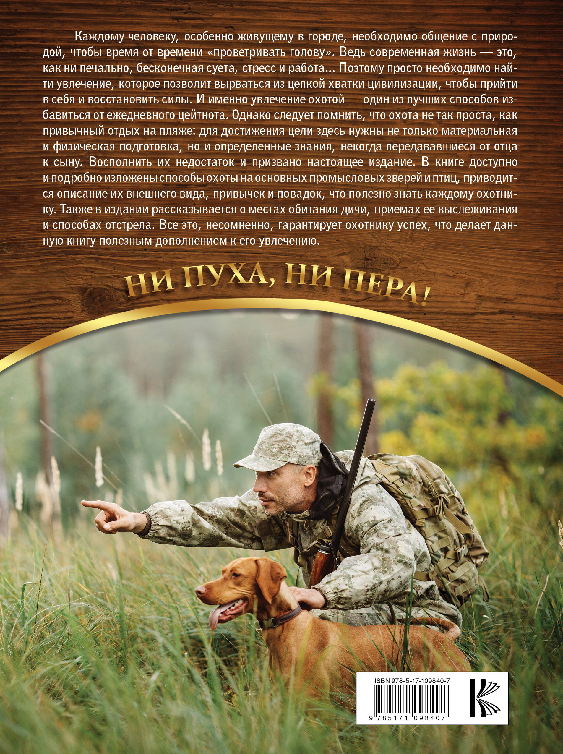 В книге интересно, доступно и подробно изложены способы охоты на основных промысловых зверей и птиц, приводится описание их внешнего вида, привычек и повадок, что полезно знать каждому охотнику. Также в издании рассказывается о местах обитания дичи, приемах ее выслеживания и способах отстрела. Все это, несомненно, гарантирует охотнику успех, что делает данную книгу полезным дополнением к его увлечению.| Издательство | Издательство "АСТ" |