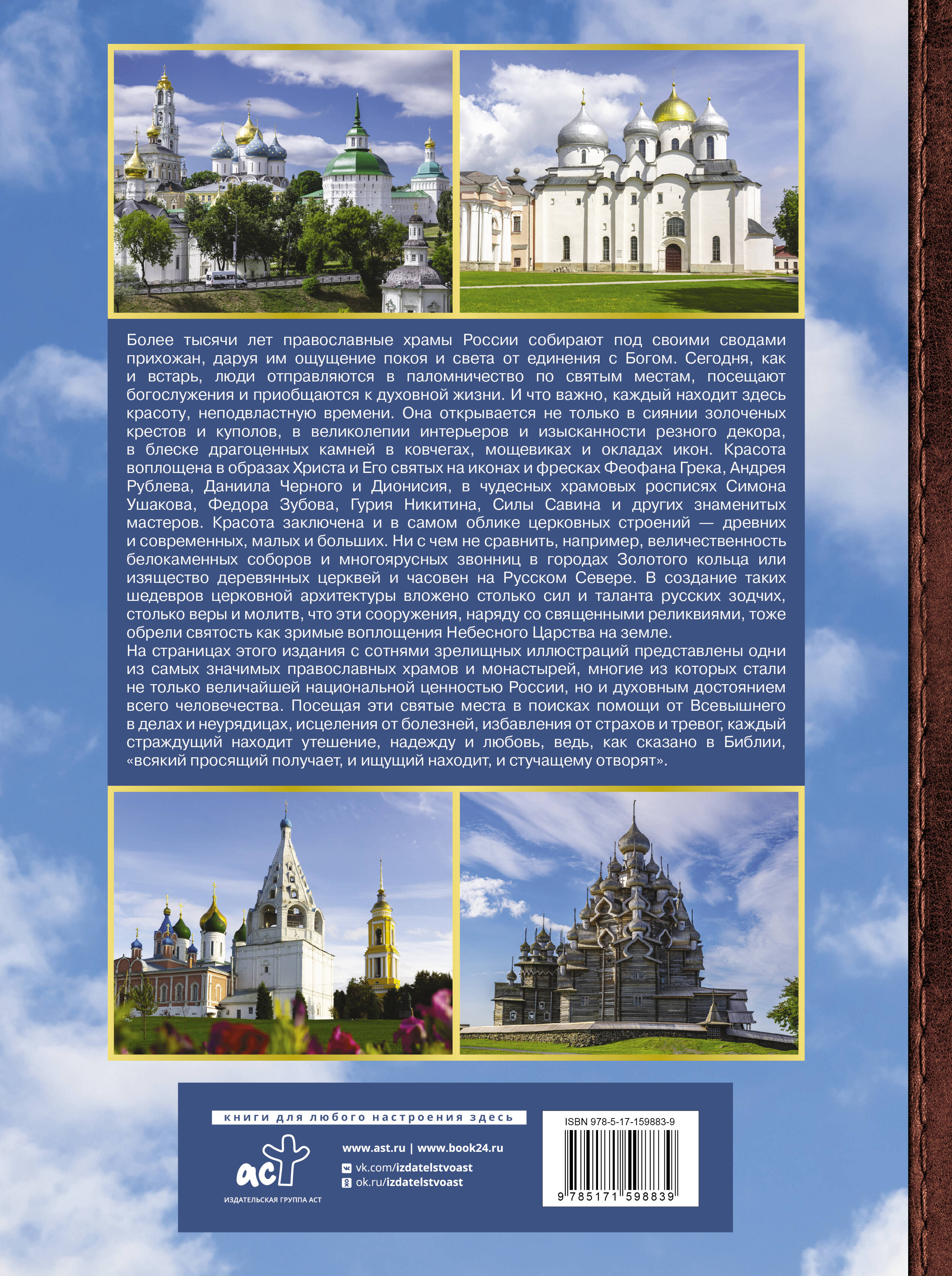 Древние белокаменные храмы - образцы домонгольского зодчества, похожие на неприступные крепости обители Русского Севера, величественные средневековые монастыри, строгие лавры, пышно отделанные кафедральные соборы, ставшие символами городов, изящные церкви и часовни, укрывшиеся за стенами древних кремлей, величавые звонницы - каждое из таких сооружений выступает хранителем богатой, более чем тысячелетней церковной традиции Святой Руси. Купола и кресты, врата и своды, иконы и фрески, драгоценные реликвии православных храмов впитали энергию веры и молитвы не одного поколения прихожан. Многие из этих святынь были поруганы, но вновь возродились в величии и славе. Многие стали знаменитыми музеями, вошли в списки культурного наследия народов Российской Федерации и Всемирного наследия ЮНЕСКО. Но главное, каждый из таких шедевров - дом Божий, корабль спасения в море житейском и оплот духовности всего общества. На страницах этого уникального издания со зрелищными иллюстрациями и важными, а порой и неожиданными фактами вы приобщитесь к сокровищнице православной культуры России, к высшей Истине и Красоте, проявленной в ее церковных святынях.| Издательство | Издательство "АСТ" |
