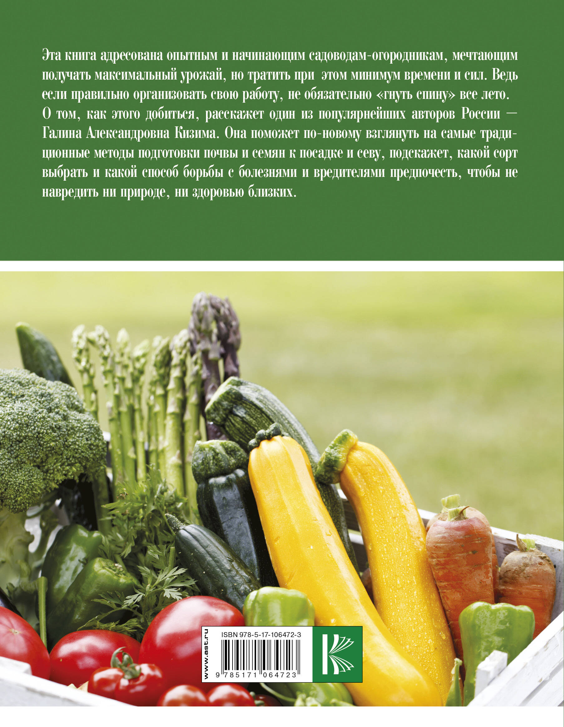 Не обязательно «гнуть спину» все лето. О том, как получать прекрасный урожай, рассказывает один из популярнейших авторов книг о саде и огороде Галина Александровна Кизима. Она поможет по-новому взглянуть на самые традиционные методы подготовки почвы и семян к посадке и севу, подскажет, какой сорт выбрать и какой способ борьбы с болезнями и вредителями предпочесть, чтобы не навредить ни природе, ни здоровью близких.