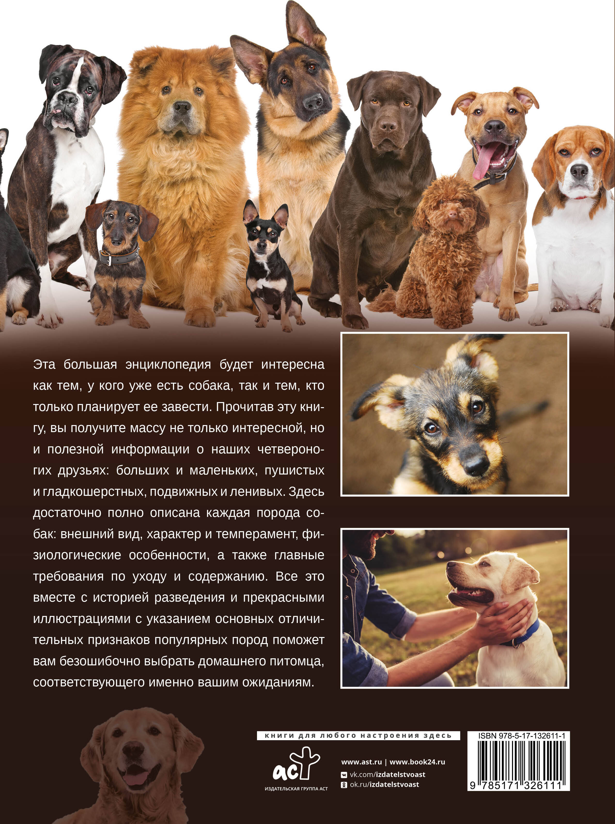 Эта большая энциклопедия будет интересна как тем, у кого уже есть собака, так и тем, кто только планирует ее завести. Прочитав эту книгу, вы получите массу не только интересной, но и полезной информации о наших четвероногих друзьях: больших и маленьких, пушистых и гладкошерстных, подвижных и ленивых. Здесь достаточно полно описана каждая порода собак: внешний вид, характер и темперамент, физиологические особенности, а также главные требования по уходу и содержанию. Всё это вместе с историей разведения и прекрасными иллюстрациями с указанием основных отличительных признаков популярных пород помогут вам безошибочно выбрать домашнего питомца, соответствующего именно вашим ожиданиям.| Издательство | ИЗДАТЕЛЬСТВО "АСТ" |