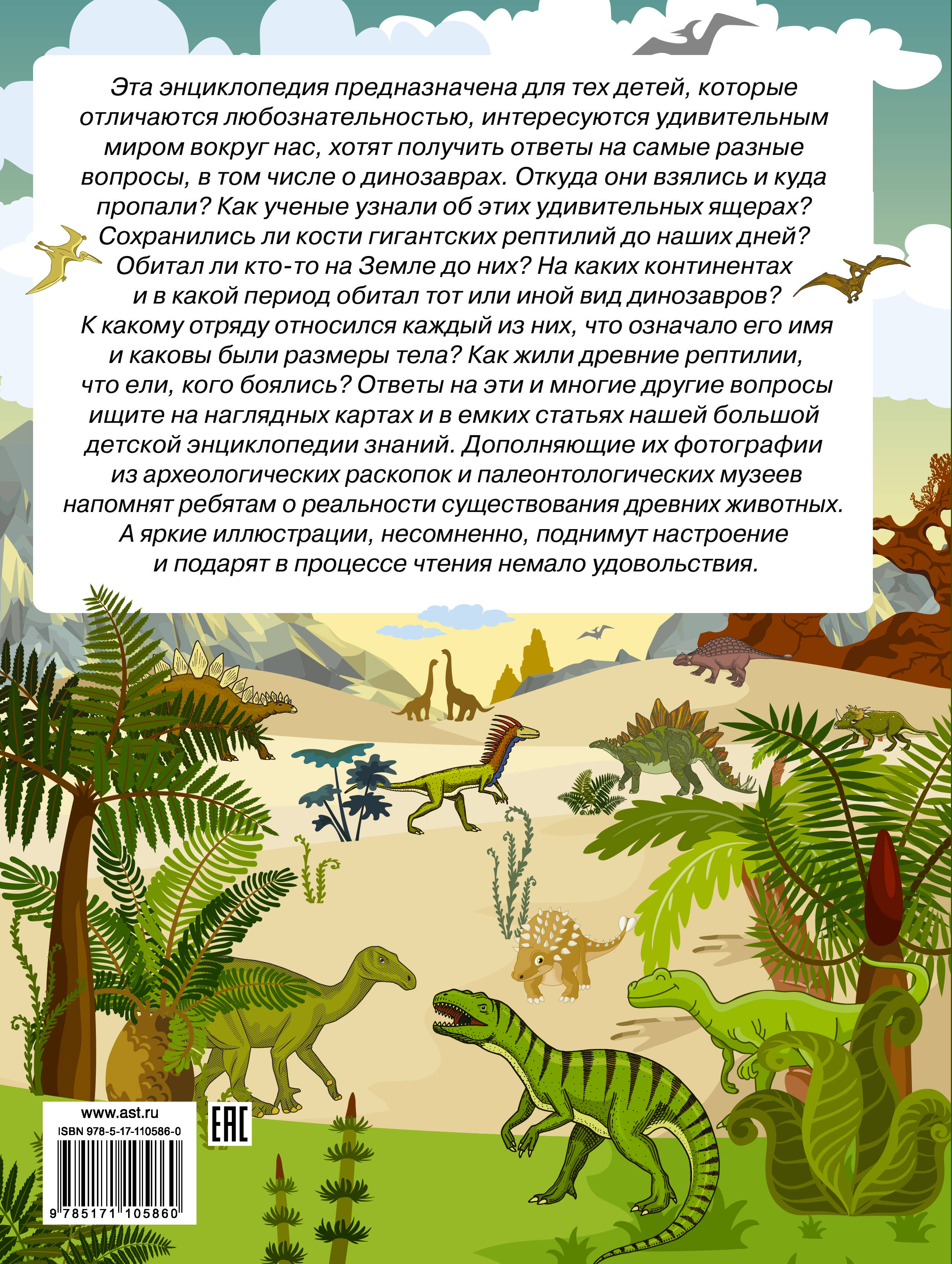Эта энциклопедия предназначена для тех детей, которые отличаются любознательностью, интересуются удивительным миров вокруг нас, хотят получить ответы на самые разные вопросы, в том числе о динозаврах. Откуда они взялись и куда пропали? Как ученые узнали об этих удивительных ящерах? Сохранились ли кости гигантских рептилий до наших дней? Обитал ли кто-то на Земле до них? На каких континентах и в какой период обитал тот или иной вид динозавров? К какому отряду относился каждый из них, что означало его имя и каковы были размеры тела? Как жили древние рептилии, что ели, кого боялись? Ответы на эти и многие другие вопросы ищите на наглядных картах и в емких статьях нашей большой детской энциклопедии знаний. Дополняющие их фотографии из археологических раскопок и палеонтологических музеев напомнят ребятам о реальности существования древних животных. А яркие иллюстрации, несомненно, поднимут настроение и подарят в процессе чтения немало удовольствия.| Издательство | ИЗДАТЕЛЬСТВО "АСТ" |