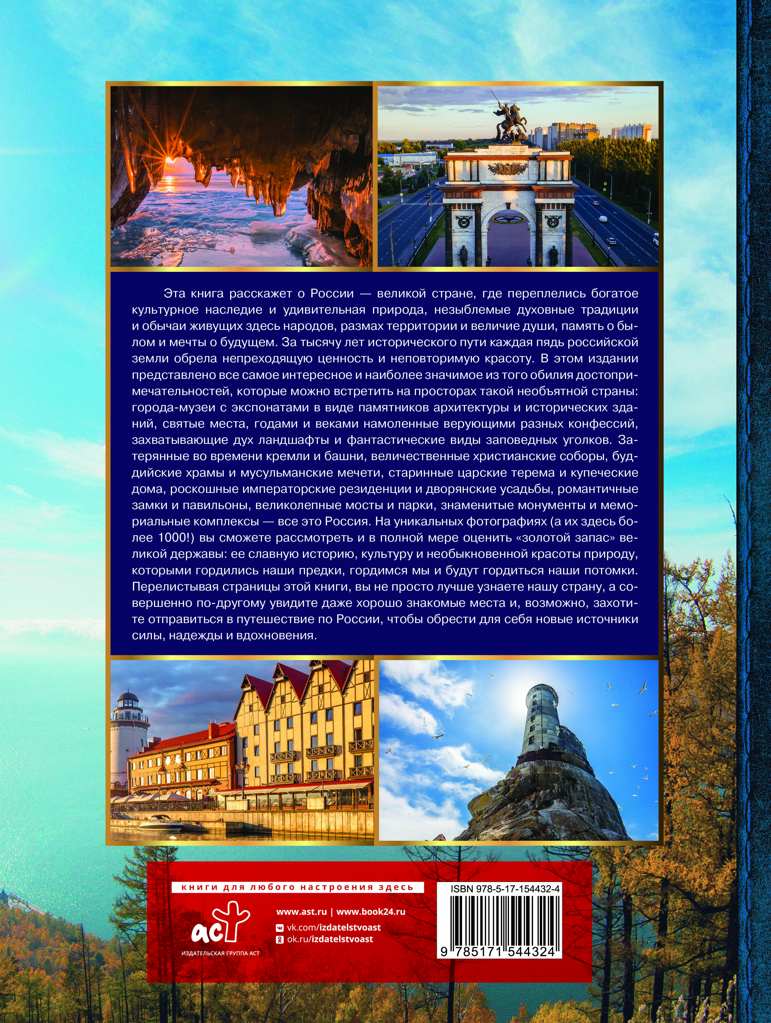 Эта книга посвящена России - великой стране, где тесно переплелись многовековая история и неповторимая культура, огромная территория и удивительной красоты природа. В издании представлено все самое значимое и интересное из того колоссального обилия достопримечательностей, которое можно встретить от западных регионов до Дальнего Востока и от Крайнего Севера до южных границ Российской Федерации. На зрелищных фотографиях, а их число превышает 1000, вы сможете рассмотреть и в полной мере оценить "золотой запас" этого многонационального государства: города-музеи с экспонатами в виде памятников архитектуры и исторических зданий, духовные святыни, годами и столетиями намоленные верующими разных конфессий, места боевой славы и народной памяти, а также захватывающие дух пейзажи и фантастические ландшафты. Вы получите шанс заново открыть для себя эту страну, и такое знакомство способно превзойти даже самые смелые ожидания, подарив незабываемые впечатления и вдохновив на новые путешествия по России.| Издательство | ИЗДАТЕЛЬСТВО "АСТ" |