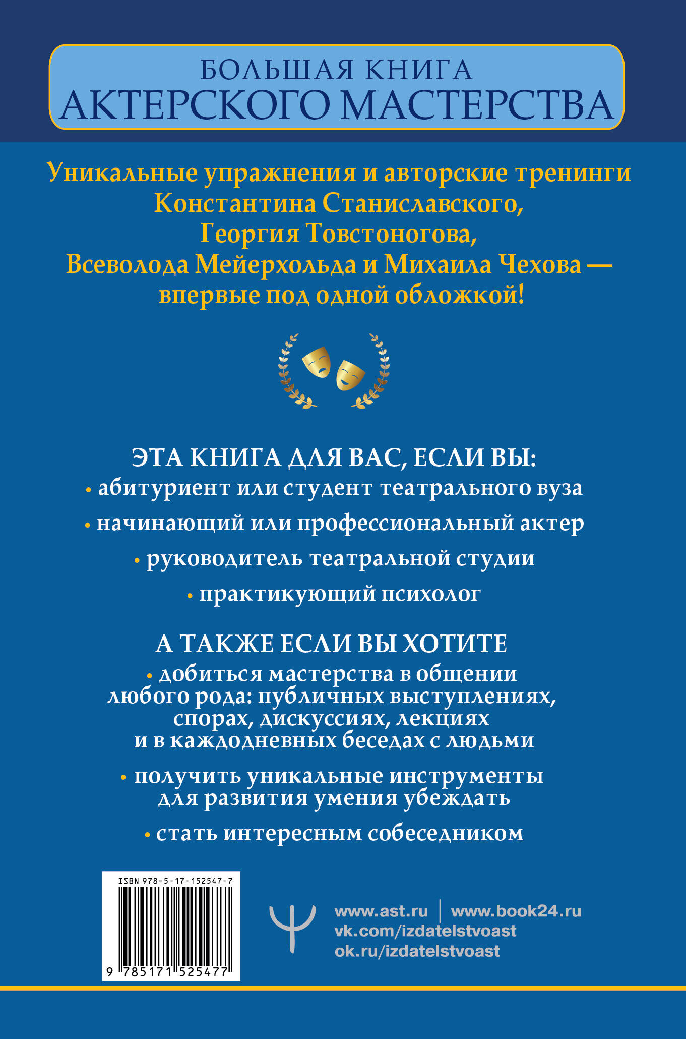 "Не верю!" Таков режиссерский прием Константина Станиславского, методика которого опередила время и вот уже более 100 лет пользуется популярностью во всем мире. Кто не мечтает раскрыть в себе актерский талант и притягивать внимание окружающих, говорить так, чтобы слушали внимательно, с восторгом. Актерское мастерство - это и есть умение выражать свои мысли и чувства настолько емко, чтобы вам верили. Эта книга - уникальное пособие для тех, кто учится или преподает в театральных вузах, в театральных студиях, или просто много общается с людьми. Вы действительно хотите стать мастером общения, обаятельным человеком, который увлекает слушателя за собой? Тогда вам помогут упражнения и авторские тренинги великих режиссеров Константина Станиславского, Георгия Товстоногова, Всеволода Мейерхольда и Михаила Чехова. Вы можете выполнять их вместо или вместе с курсом профессиональной подготовки. Книга собрала множество позитивных отзывов читателей и выдержала несколько изданий. Эта книга будет интересна: • Тем, кто хочет развить актерские навыки по методикам великих мастеров. • Тем, кто учится или преподает в театральных вузах, факультетах журналистики. • А также и тем, кто по каким-то причинам не может очно пройти курс актерского мастерства, но готов получить комплексные знания из книги. • Тем, кто хочет быть мастером общения. • Тем, кто хочет знать, как устроен мир театра и кино.| Издательство | ИЗДАТЕЛЬСТВО "АСТ" |