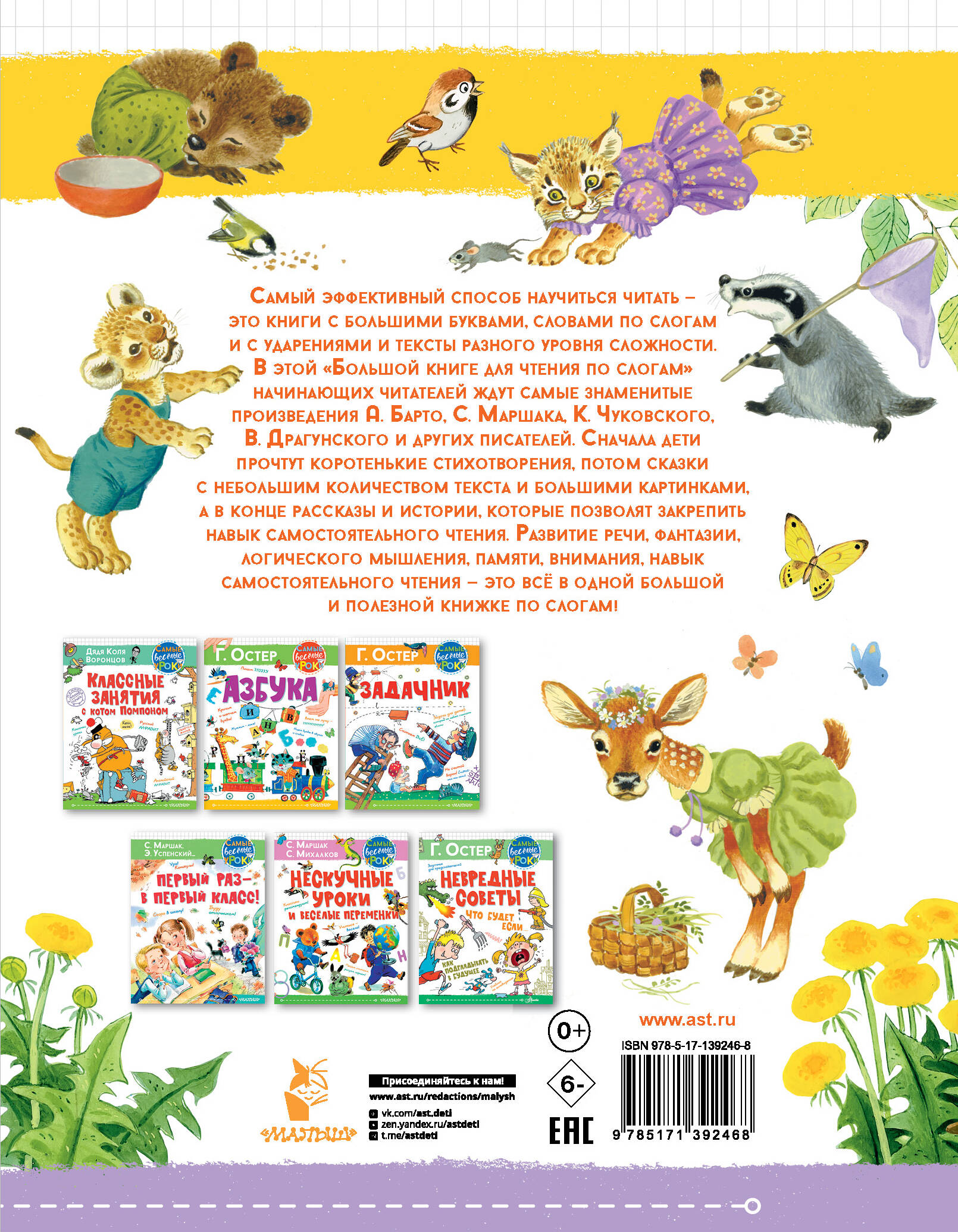 В "Большую книгу для чтения по слогам" вошли самые знаменитые произведения С. Маршака, С. Михалкова, А. Барто, В. Драгунского, Г. Остера и других писателей для первого самостоятельного чтения для детей. В книге три раздела: стихи, сказки, рассказы и истории. Сначала детей ждут коротенькие стихотворения, которые нестрашно читать из-за их маленького объёма. Потом идут сказки с небольшим количеством текста на странице и большими картинками, которые тоже легко прочитать самим. В конце идут небольшие рассказы и истории, а в самом конце детей ждёт большой полноценный рассказ, на котором можно проверить, смогут ли дети читать большие тексты. Во всей книге очень большой шрифт, все слова даны по слогам с ударениями, что поможет освоить слоговое чтение и научиться читать! В книге большие великолепные иллюстрации, помогающие маленьким читателям легче освоить чтение. Для дошкольного чтения.| Издательство | Издательство "АСТ" |
