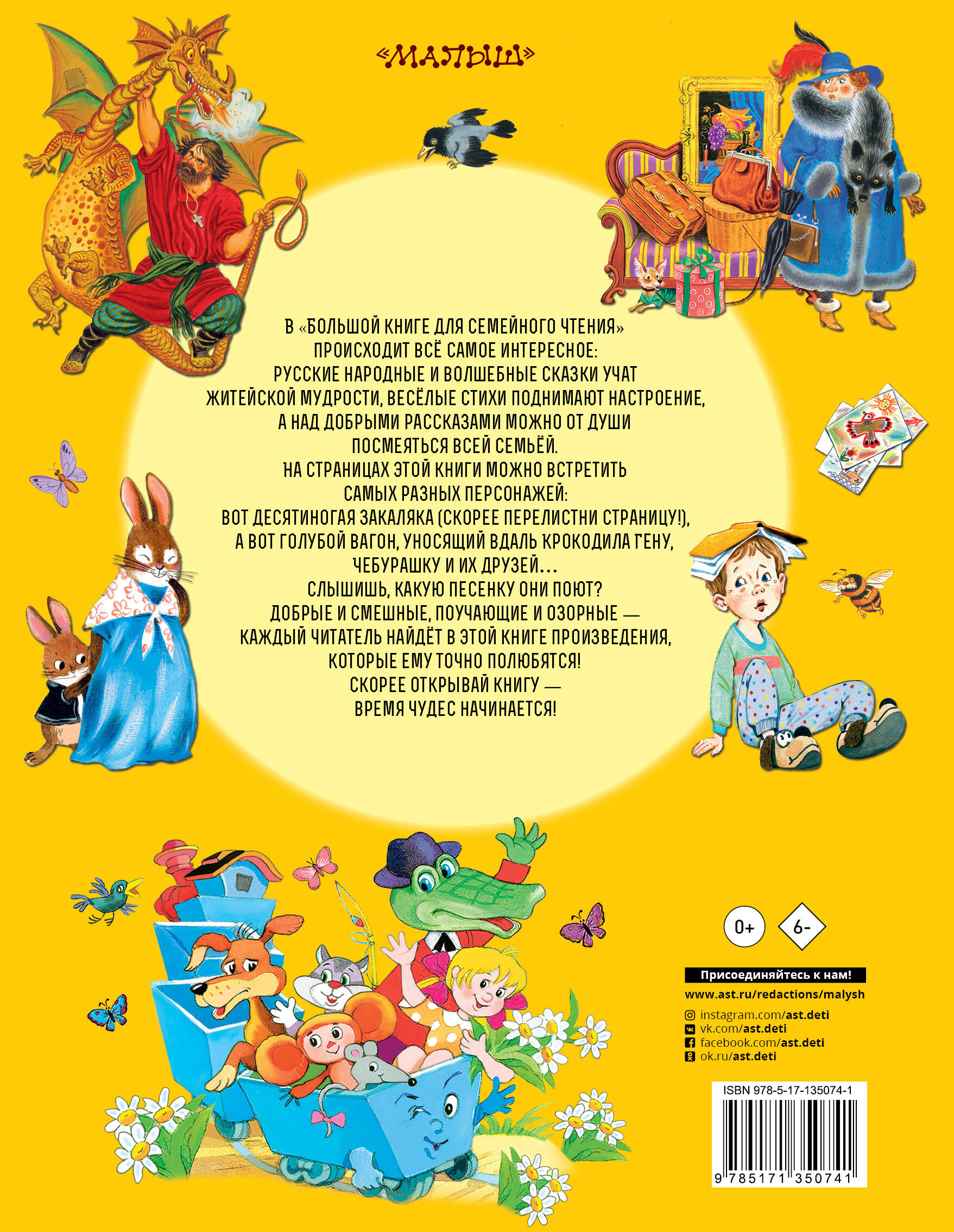 С. Маршак, С. Михалков, Э. Успенский и другие детские писатели создали очень много хороших произведений для детей. Но как выбрать самое необходимое? Как дошкольнику прочитать самое нужное? В книгу "Большая книга для семейного чтения" вошли тематические разделы: загадки, русские народные сказки, рассказы о животных, о природе, о мальчишках и девчонках, стихи, сказки русских и зарубежных писателей. Таким образом ребёнок познакомится с произведениями целого ряда авторов, среди которых классики детской литературы, увидит иллюстрации известных художников: В.Чижикова, Э. Булатова и О. Васильева, А. Савченко, О. Зотова и других. Книга подойдёт как для семейного, так и для самостоятельного чтения и станет верным спутником во время обучения ребёнка в школе. Для старшего дошкольного возраста.| Издательство | Издательство "АСТ" |