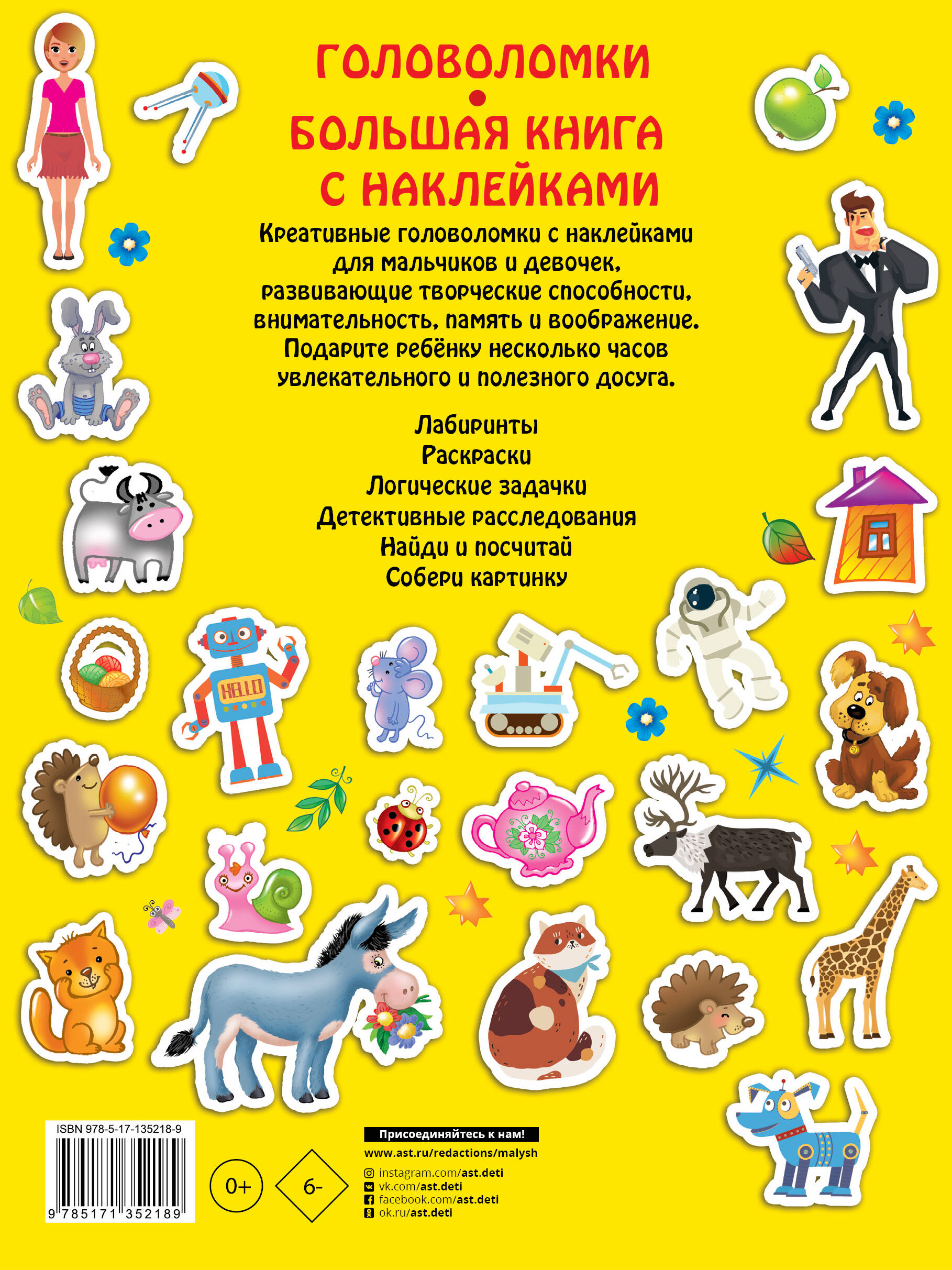 Большая книга головоломок с наклейками - это увлекательное путешествие в мир креативных головоломок, увлекательных заданий и красочных наклеек. Ребята смогут отправиться в открытый космос, погулять по Африке, исследовать таинственный подводный мир и даже встретиться с настоящими динозаврами! А ещё книга поможет развить творческие способности и мышление, потренирует память и внимательность. Добро пожаловать в мир головоломок! Для дошкольного возраста.| Издательство | ИЗДАТЕЛЬСТВО "АСТ" |