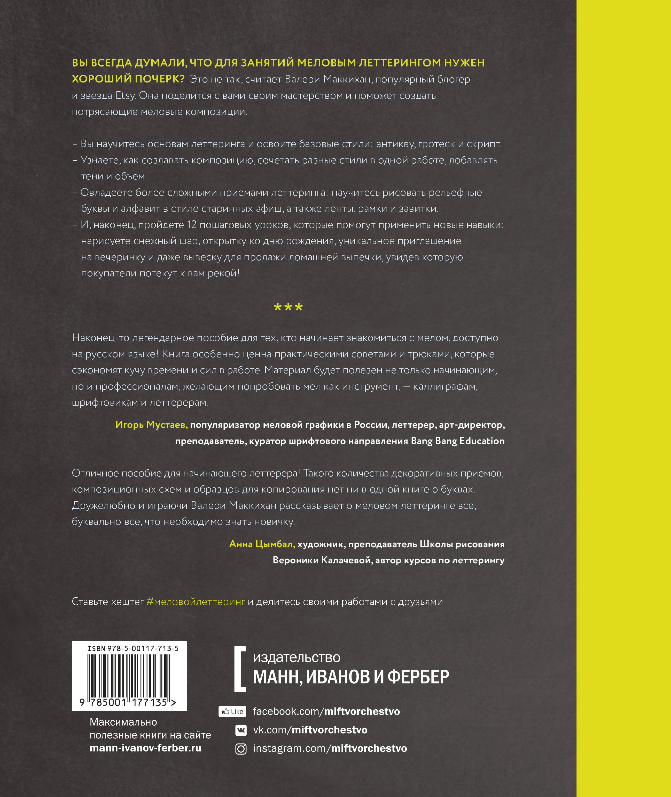 Валери Маккихан, популярный блогер и звезда Etsy, научит основам мелового леттеринга и созданию композиции, поможет освоить как базовые стили, так и более сложные приемы, а также предложит 12 пошаговых уроков для закрепления полученных навыков.| Издательство | МАНН, ИВАНОВ И ФЕРБЕР ООО |