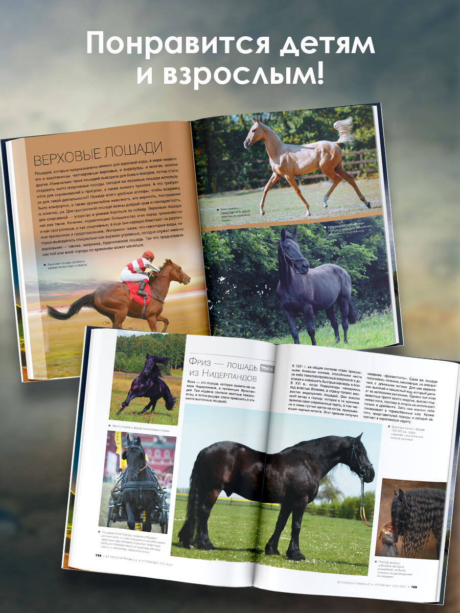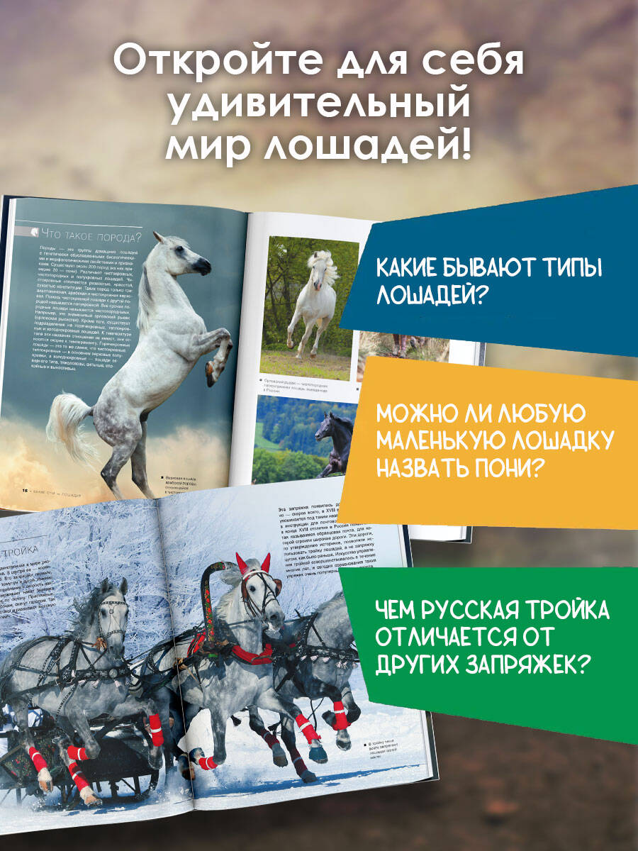 Чтобы познакомиться с лошадьми поближе, полюбоваться их статями и аллюрами, а также оценить роль этих грациозных животных в истории человечества, вовсе не обязательно отправляться в конноспортивную школу, на соревнования или конный парад. Достаточно открыть данную книгу - и вы окажетесь в удивительном мире благородных скакунов, могучих тяжеловозов и очаровательных мини-лошадок, которые вот уже несколько тысячелетий живут рядом с людьми, разделяя с ними тяготы труда и военные будни, веселье праздников и торжеств, вдохновляя своей красотой, удивляя резвостью и иными потрясающими способностями. На уникальных фотографиях вы сможете рассмотреть в эффектных ракурсах и мельчайших подробностях лошадей самых разных размеров и пород. Рожденные в пустыне верные ахалтекинцы, гордые и быстрые андалузы, неукротимые вольные мустанги, элегантные орловские рысаки, сильные владимирские тяжеловозы, огромные выносливые шайры, маленькие крепкие пони, изящные и дружелюбные мини-лошадки и другие кони предстанут перед вашими глазами, восхищая природным обаянием, гармонией и стремительностью движений. А краткие, но исчерпывающие статьи, сопровождающие зрелищные съемки, позволят больше узнать об этих прекрасных животных, условиях их содержания и выведения, об аллюрах и мастях, темпераменте и нраве, а также значении в жизни человека. Все разнообразие мира лошадей и пони - в одном издании! Для старшего школьного возраста.| Издательство | Издательство "АСТ" |