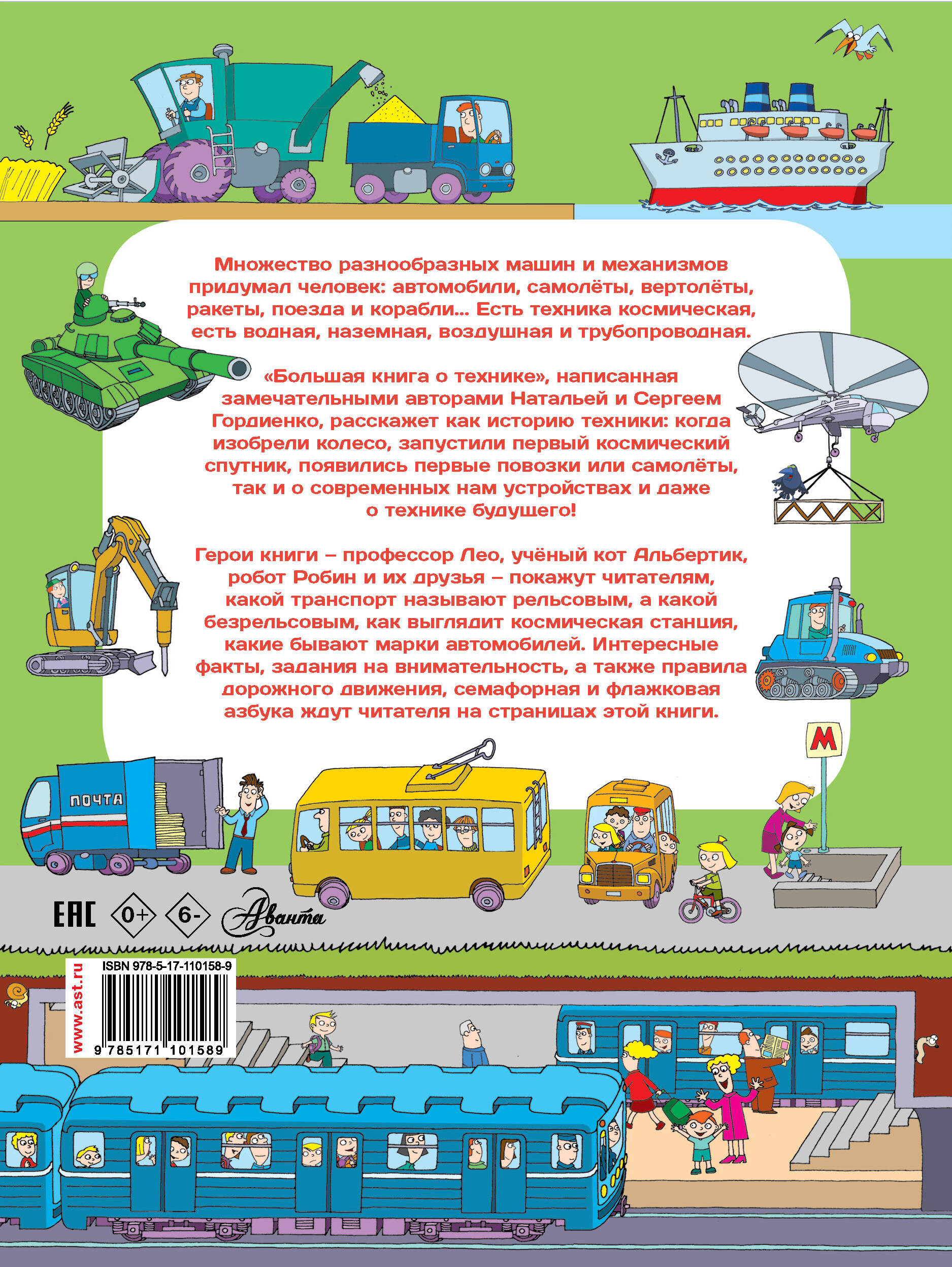 Множество разнообразных машин и механизмов придумал человек: автомобили, самолёты, вертолёты, ракеты, поезда и корабли... Профессор Лео, учёный кот Альбертик, робот Робин и их друзья расскажут читателям о разных видах техники. Какой транспорт называют рельсовым, а какой безрельсовым? Что такое фуникулёр? Как выглядит космическая станция? Какие бывают марки автомобилей? Интересные факты из истории техники, забавные иллюстрации, лабиринты, задания на внимательность, а также правила дорожного движения, дорожные знаки, семафорная и флажковая азбука ждут на страницах новой увлекательной книги Натальи и Сергея Гордиенко - "Большая книга о технике". Для младшего школьного возраста.| Издательство | ИЗДАТЕЛЬСТВО "АСТ" |