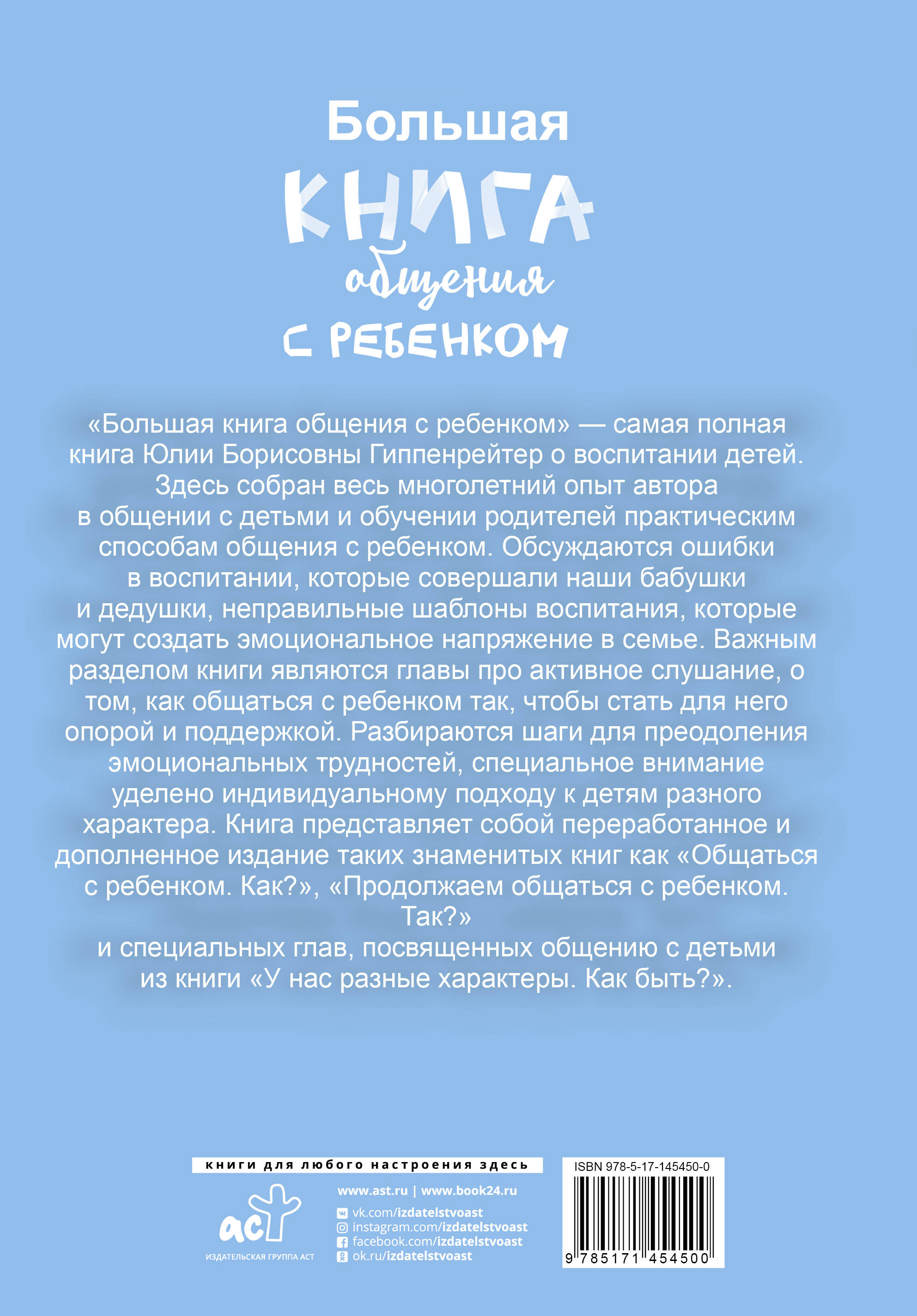 "Большая книга общения с ребенком" - самая полная книга Юлии Борисовны Гиппенрейтер о воспитании детей. Здесь собран весь многолетний опыт автора в общении с детьми и обучении родителей практическим способам общения с ребенком. Обсуждаются ошибки в воспитании, которые совершали наши бабушки и дедушки, неправильные шаблоны воспитания, которые могут создать эмоциональное напряжение в семье. Важным разделом книги являются главы про активное слушание, о том, как общаться с ребенком так, чтобы стать для него опорой и поддержкой. Разбираются шаги для преодоления эмоциональных трудностей, специальное внимание уделено индивидуальному подходу к детям разного характера. Книга представляет собой переработанное и дополненное издание таких знаменитых книг как "Общаться с ребенком. Как?", "Продолжаем общаться с ребенком. Так?" и специальных глав, посвященных общению с детьми из книги "У нас разные характеры. Как быть?".| Издательство | Издательство "АСТ" |