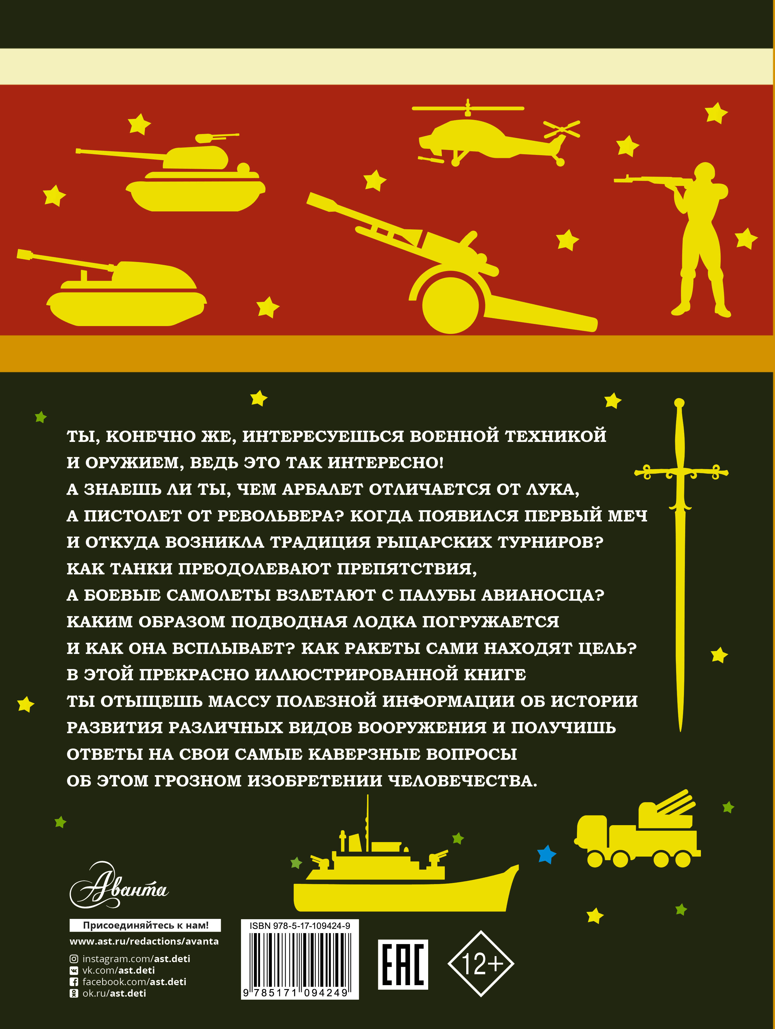 Ты, конечно же, интересуешься военной техникой и оружием, ведь это так интересно! А знаешь ли ты, чем арбалет отличается от лука, а пистолет от револьвера? Когда появился первый меч и откуда возникла традиция рыцарских турниров? Как танки преодолевают препятствия, а боевые самолеты взлетают с палубы авианосца? Каким образом подводная лодка погружается и как она всплывает? Как ракеты сами находят цель? В этой прекрасно иллюстрированной книге ты отыщешь массу полезной информации об истории развития различных видов вооружения и получишь ответы на свои самые каверзные вопросы об этом грозном изобретении человечества.| Издательство | Издательство "АСТ" |