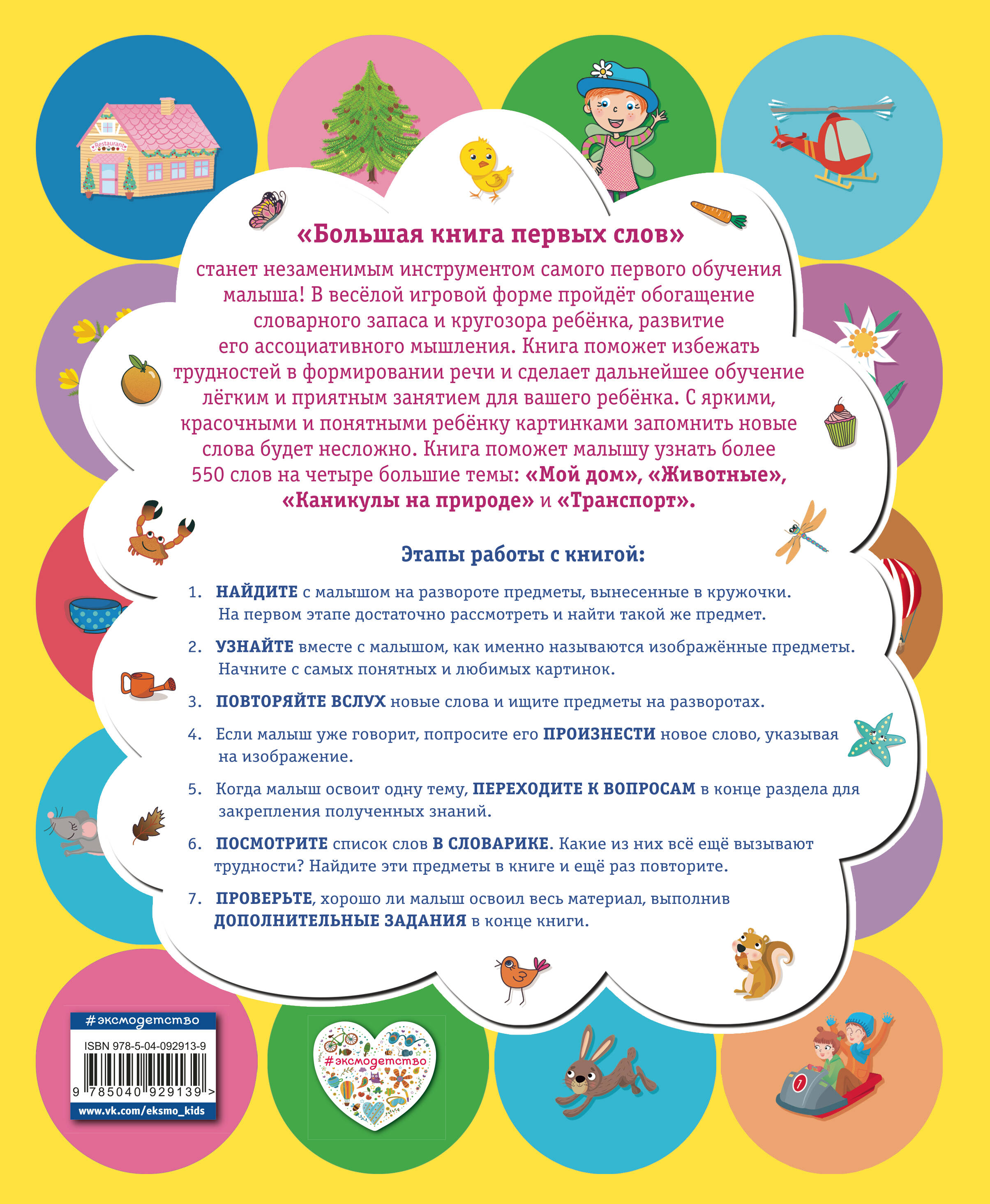 «Большая книга первых слов» станет незаменимым инструментом самого первого обучения малыша! В весёлой игровой форме пройдёт обогащение словарного запаса и кругозора ребёнка, развитие его ассоциативного мышления. Книга поможет избежать трудностей в формировании речи и сделает дальнейшее обучение лёгким и приятным занятием для Вашего ребёнка. С яркими, красочными и понятными ребёнку картинками, запомнить новые слова будет несложно. Книга поможет узнать малышу более 550 слов на четыре большие темы: «Мой дом», «Животные», «Каникулы на природе» и «Транспорт».