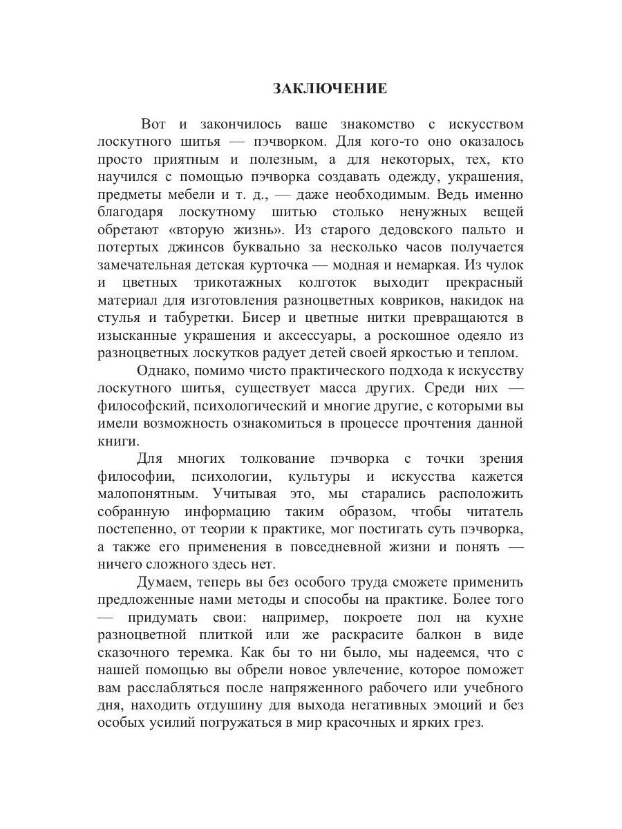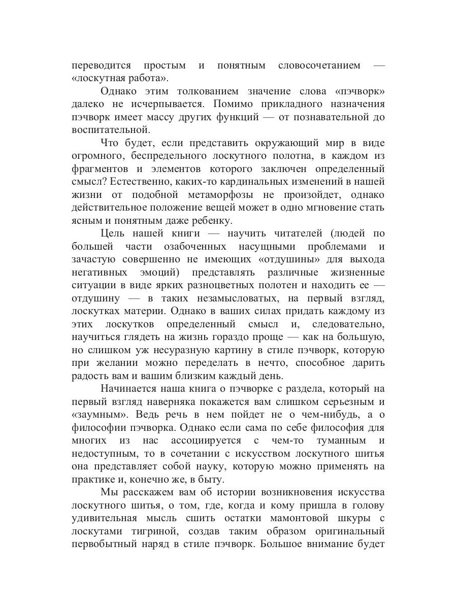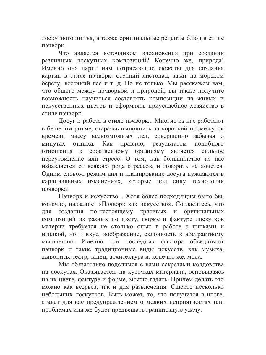 Нередко жизнь кажется сложной и запутанной, человек чувствует себя потерянным и не решается что-либо делать, боясь усложнить ее еще больше. Изменить отношение к жизни поможет пэчворк. Стоит только представить себя, свое окружение, а также многочисленные проблемы, переживания, болезни и прочие мелочи, которые портят настроение и убивают всякое желание действовать, в виде разноцветных лоскутков: больших и маленьких, ярких и бледных, гладких и шероховатых, как тотчас все станет на свои места и мир раскрасится во все цвета радуги. Именно об этом книга «Пэчворк», рассчитанная на читателей, ценящих прекрасное и имеющих чувство юмора.| Издательство | Т8 RUGRAM |