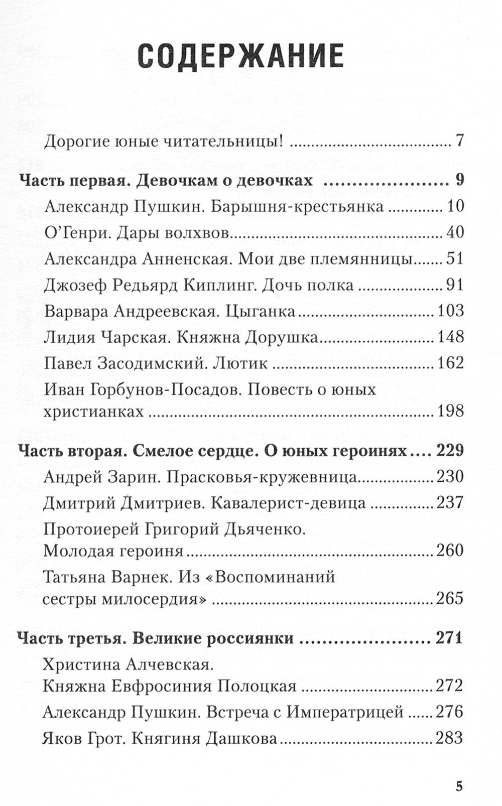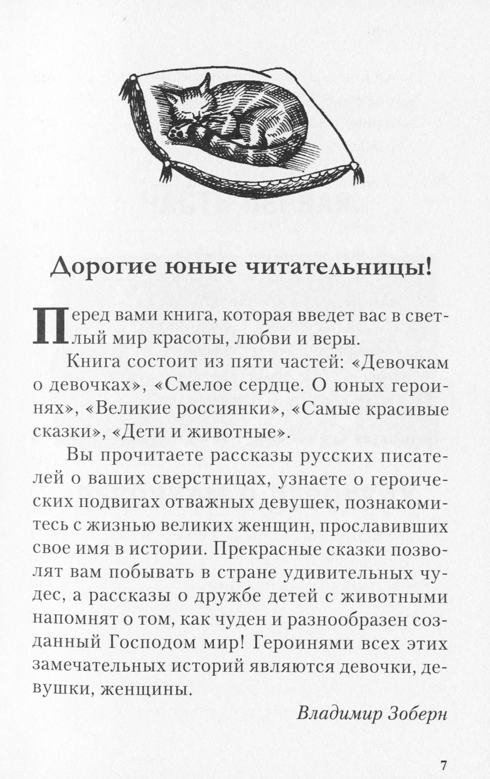 Эта большая книга откроет для тебя светлый мир красоты, любви и веры. - Девочкам о девочках - О юных героинях - О великих россиянках - Самые красивые сказки - О детях и животных Прекрасные сказки позволят вам побывать в стране чудес, а рассказы о дружбе детей и животных напомнят о том, как удивителен созданный Господом мир! Вы прочитаете рассказы русских писателей о ваших сверстницах, узнаете о героических подвигах отважных девушек, познакомитесь с жизнью великих женщин.| Издательство | Синопсисъ |