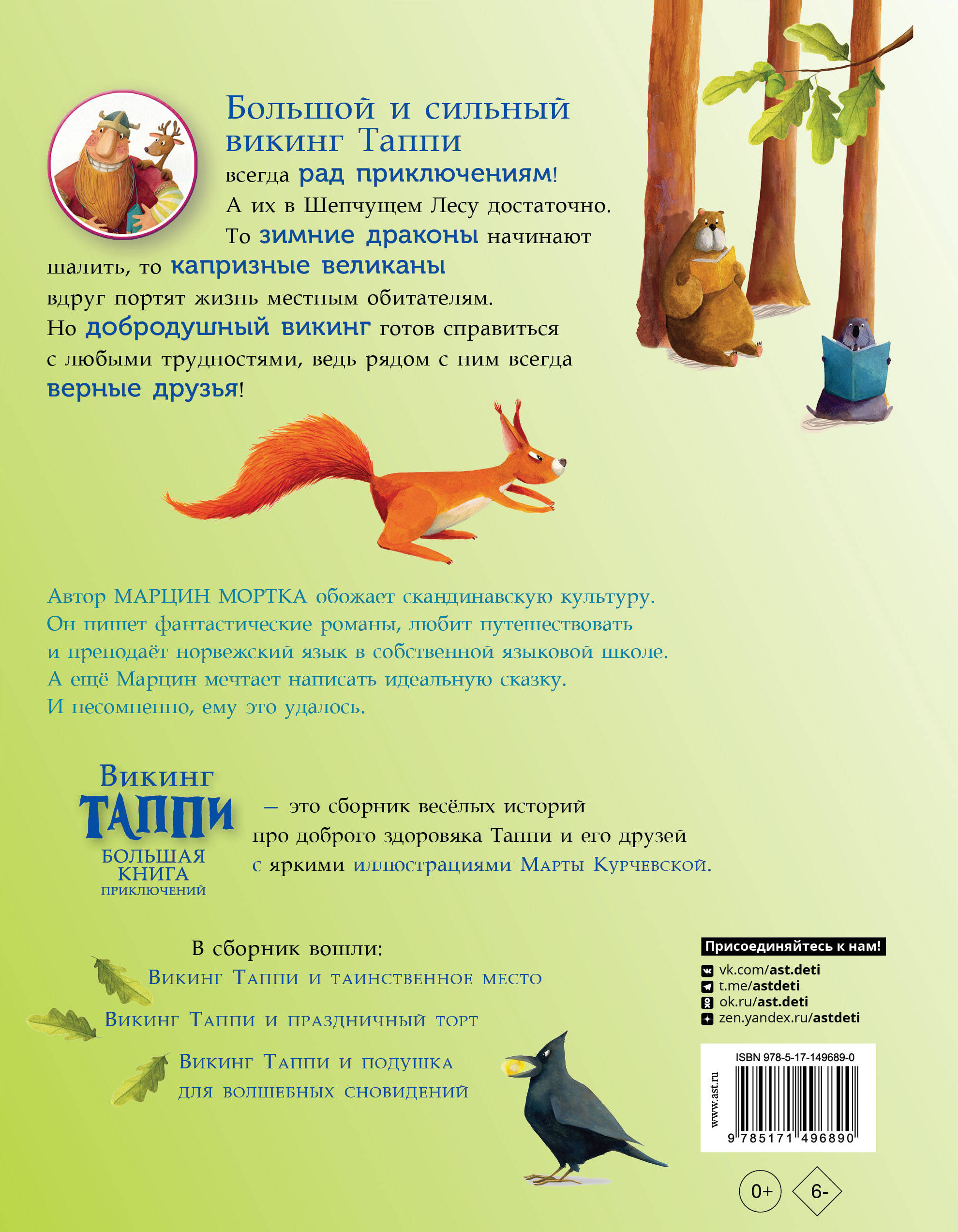 Редакция "Вилли Винки" представляет! Целый сборник сказок о приключениях добряка-викинга и его друзей! Красочные истории о драконах, великанах, зверятах, гномах - в этой большой книге поместилось сразу три книги поменьше: "Таппи и таинственное место", "Таппи и праздничный торт", "Таппи и подушка для волшебных снов". Каждая история содержит ненавязчивый поучительный смысл. Читатели запомнят и выучат важные правила поведения и безопасности, научатся по-настоящему дружить и быть ответственными. Автор Марцин Мортка обожает скандинавскую культуру. Он пишет фантастические романы, любит путешествовать и преподаёт норвежский язык в собственной языковой школе. А ещё Марцин мечтает написать идеальную сказку. И, несомненно, ему это удалось. "Большая книга приключений викинга Таппи" - это сборник весёлых историй про доброго здоровяка Таппи и его друзей с яркими иллюстрациями Марты Курчевской. В сборник вошли "Викинг Таппи и таинственное место", "Викинг Таппи и праздничный торт", "Викинг Таппи и подушка для волшебных сновидений".| Издательство | АСТ |