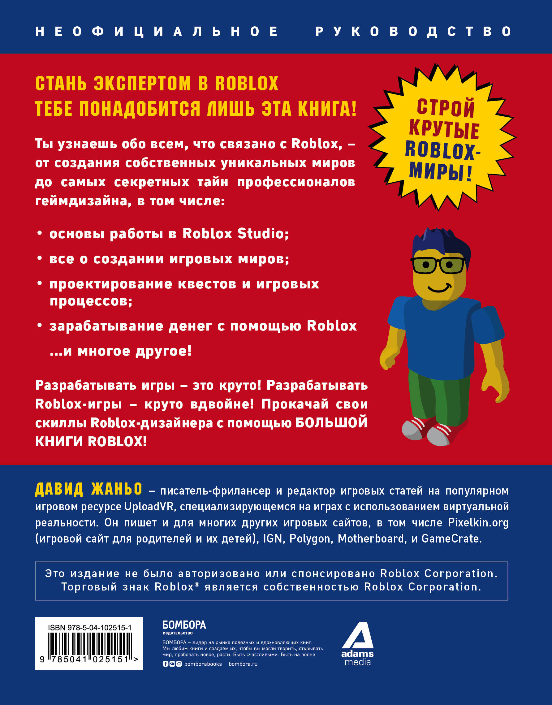 Ты узнаешь обо всем, что связано с Roblox - от создания собственных уникальных миров до самых секретных тайн профессионалов геймдизайна, в том числе: • основы работы в Roblox Studio; • всё о создании игровых миров; • проектирование квестов и игровых процессов; • зарабатывание денег с помощью Roblox… И многое другое! Разрабатывать игры - это круто! Разрабатывать Roblox-игры - круто вдвойне! Прокачай свои скиллы Roblox-дизайнера с помощью БОЛЬШОЙ КНИГИ ROBLOX! Дэвид Жаньо - писатель-фрилансер и редактор игровых статей на популярном игровом ресурсе UploadVR, специализирующемся на играх с виртуальной реальностью. Он пишет и для многих других игровых сайтов, в том числе Pixelkin.org (игровой сайт для родителей и их детей), IGN, Polygon, Motherboard, и GameCrate.| Издательство | ООО "Издательство "Эксмо" |
