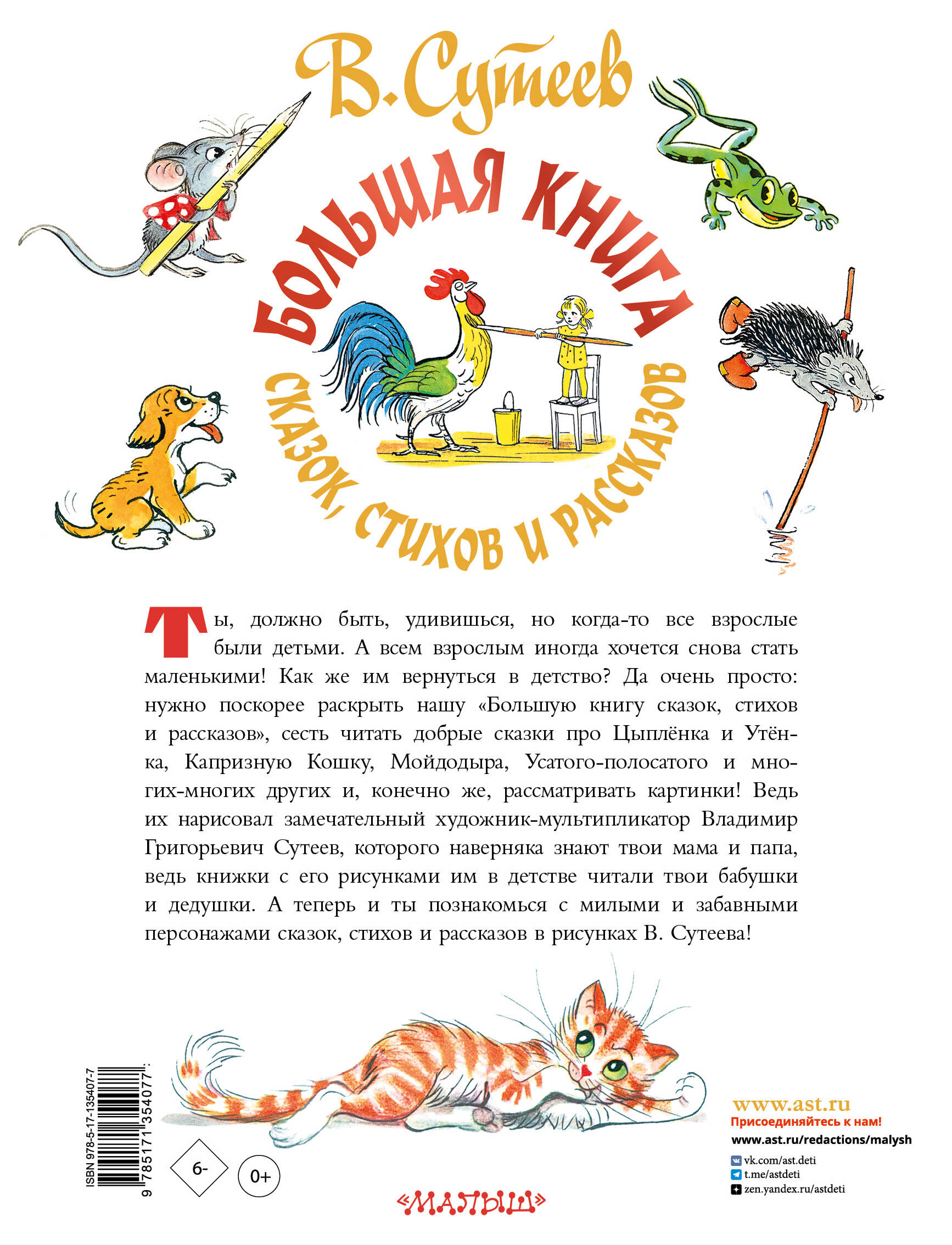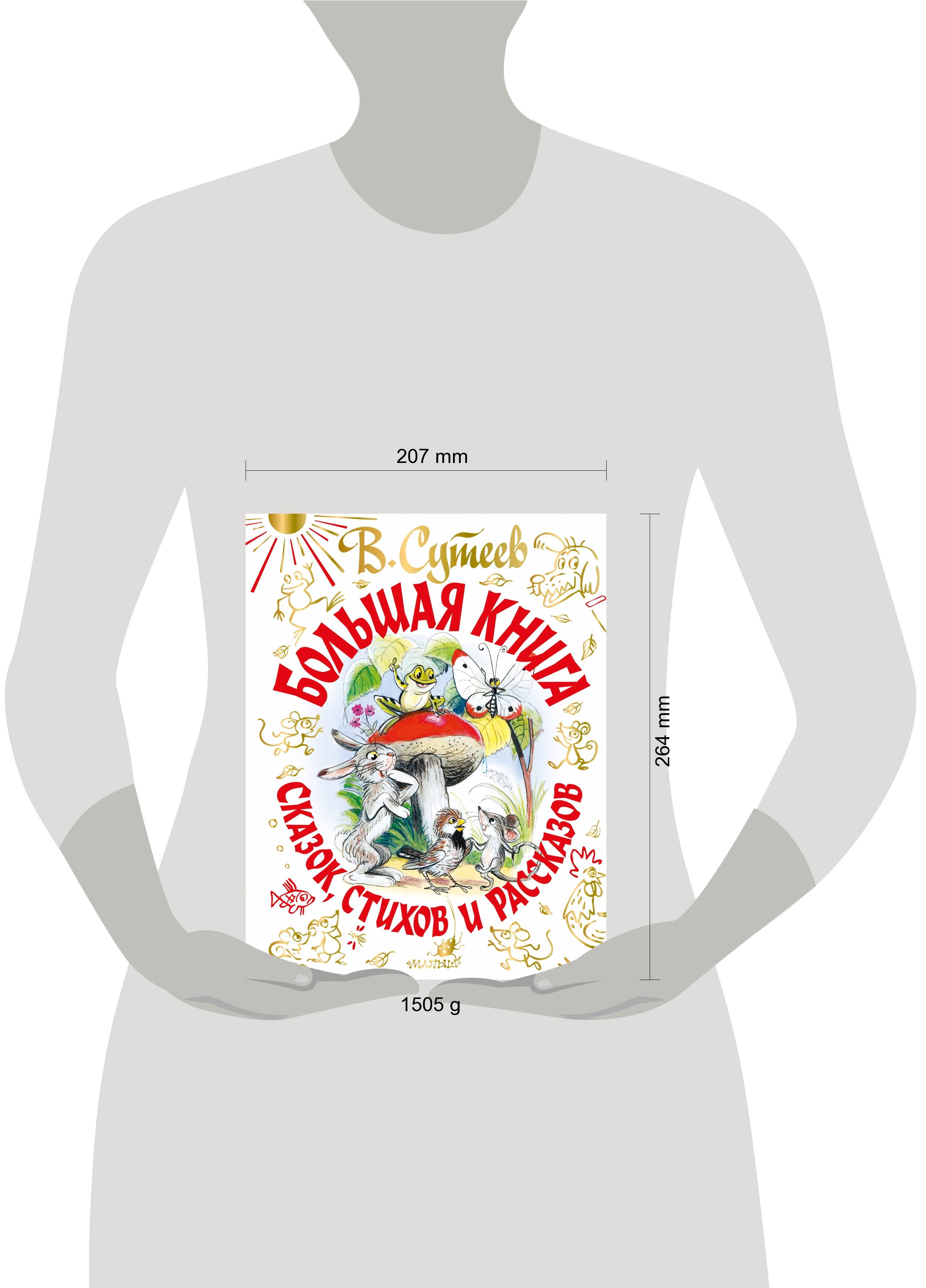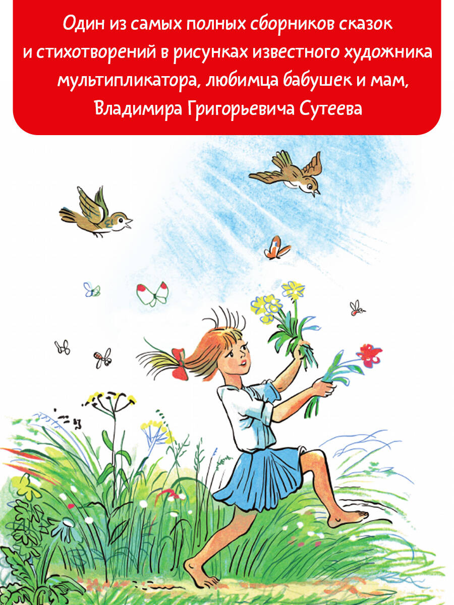 Ты, должно быть, удивишься, но когда-то все взрослые были детьми. А всем взрослым иногда хочется снова стать маленькими! Как же им вернуться в детство? Да очень просто: нужно поскорее раскрыть нашу «Большую книгу сказок, стихов и рассказов», сесть читать добрые сказки про Цыплёнка и Утёнка, Капризную Кошку, Мойдодыра, Усатого-полосатого и многих-многих других и, конечно же, рассматривать картинки! Ведь их нарисовал замечательный художник-мультипликатор Владимир Григорьевич Сутеев, которого наверняка знают твои мама и папа, ведь книжки с его рисунками им в детстве читали твои бабушка и дедушка. А теперь и ты познакомься с милыми и забавными персонажами сказок, стихов и рассказов в рисунках В. Сутеева!| Издательство | ИЗДАТЕЛЬСТВО "АСТ" |