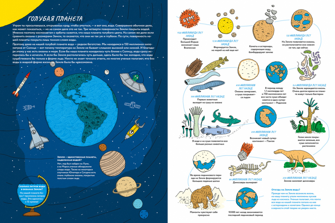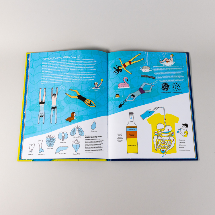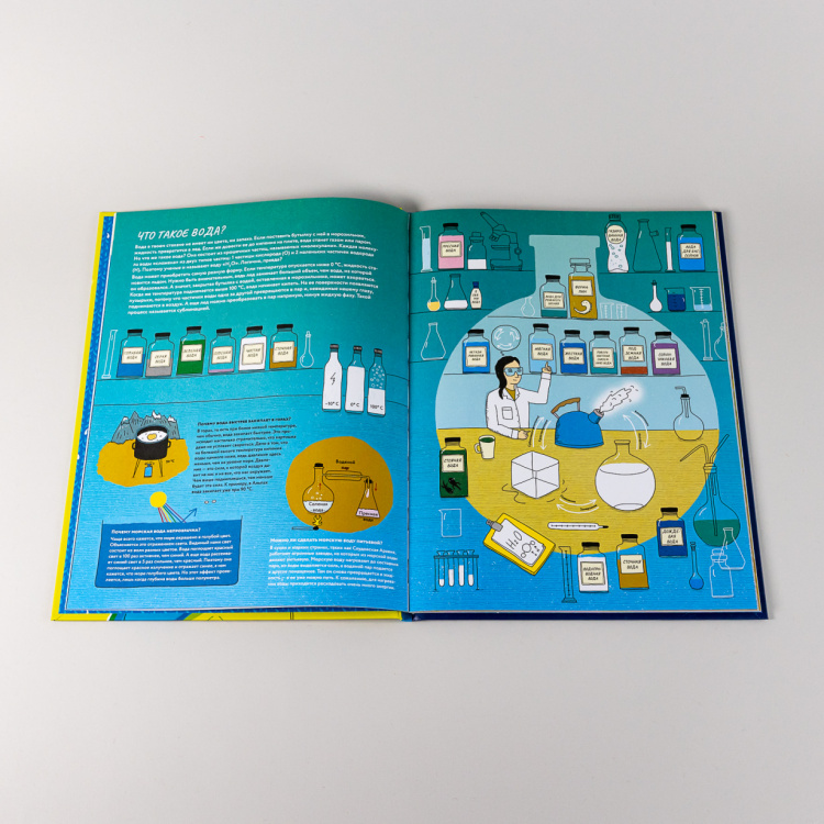 «Вода в твоем стакане не имеет ни цвета, ни запаха. Если поставить бутылку с ней в морозильник, жидкость превратится в лед. Если же довести ее до кипения на плите, вода станет газом или паром. Но что же такое вода? Она состоит из крошечных частиц, называемых "молекулами". Каждая молекула воды "сложена" из двух типов частиц: 1 частицы кислорода (О) и 2 маленьких частичек водорода (Н). Поэтому ученые и называют воду "Н2О". Логично, правда?»