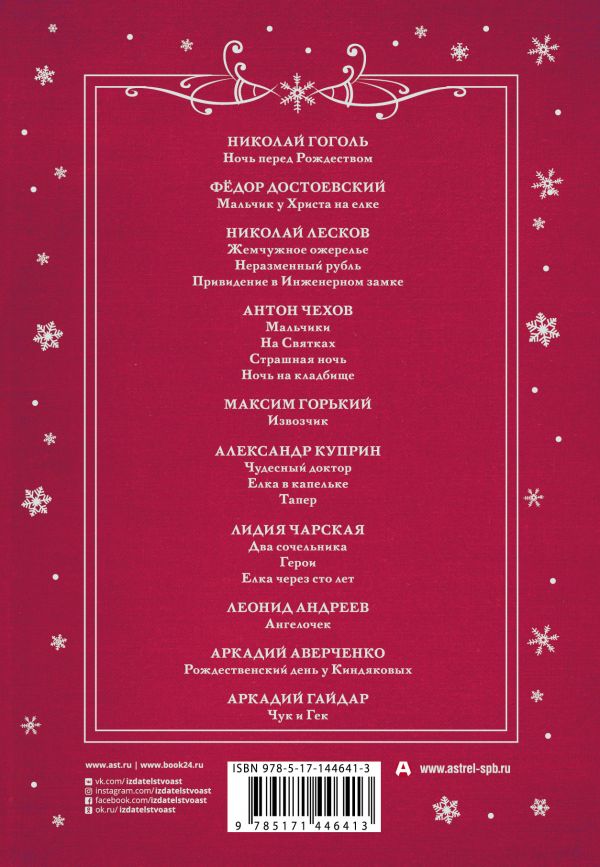 В этом уникальном издании собраны, пожалуй, все самые известные рассказы и повести, написанные на русском языке в жанре рождественского, или святочного, рассказа: от «Ночи перед Рождеством» Николая Гоголя до «Чука и Гека» Аркадия Гайдара. Помимо хрестоматийных произведений Николая Лескова, Антона Чехова и Александра Куприна в сборник включены рассказы: «Мальчик у Христа на елке» Фёдора Достоевского, «Извозчик» Максима Горького, «Ангелочек» Леонида Андреева, подборка рассказов Лидии Чарской и «Рождественский день у Киндяковых» Аркадия Аверченко.