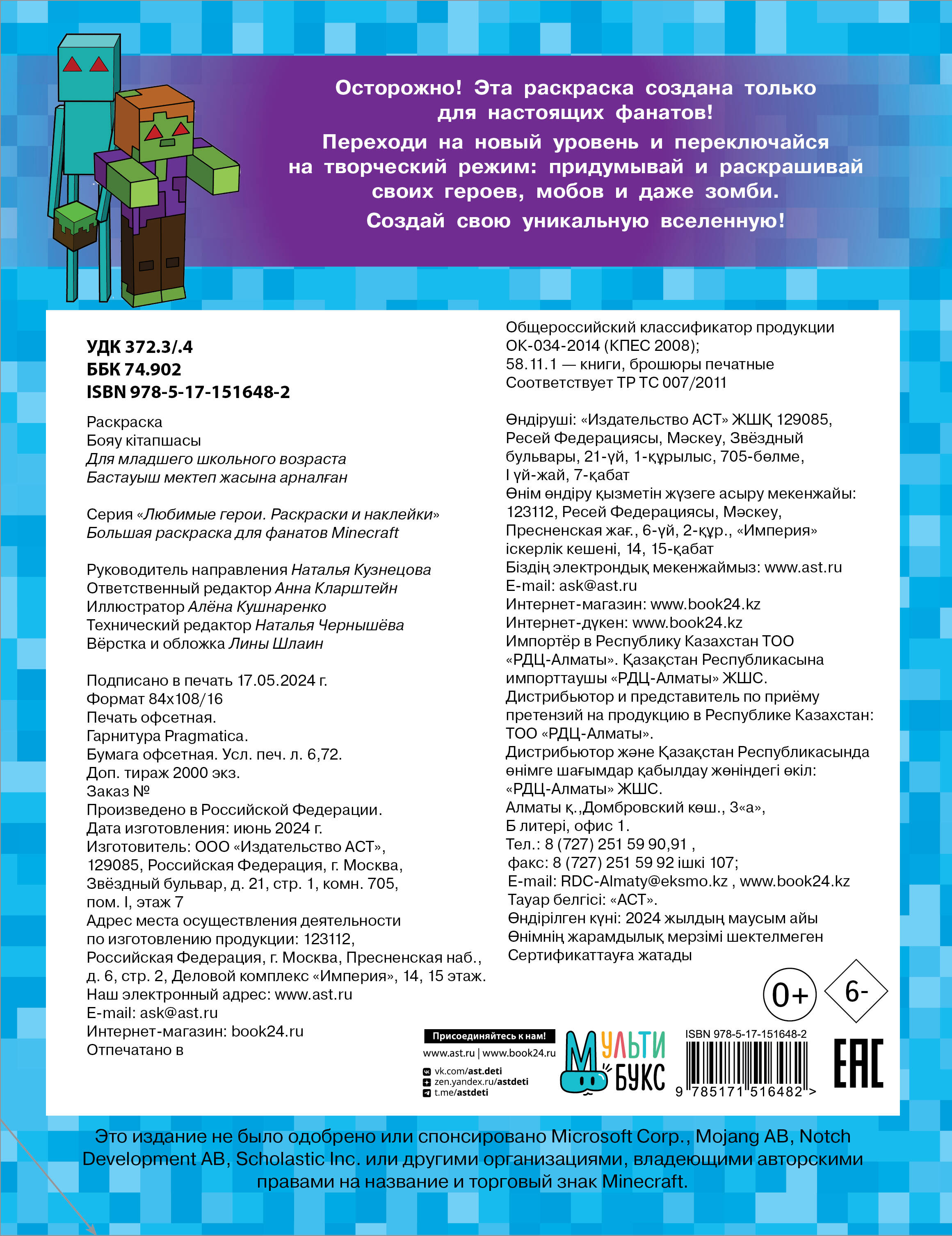 - Самая большая раскраска для всех фанатов Minecraft! - Minecraft - легендарная творческая песочница и одна из самых популярных игр в мире. - Если нужно передохнуть от компьютера или телефона, а с любимыми героями Minecraft расставаться не хочется, то раскраска - отличная замена и повод размять руки и проявить воображение. - Фантазируй и придумывай собственные скины для персонажей и пейзажей! - Большие детали и четкие границы деталей - раскраску удобно и легко раскрашивать. - На страницах раскраски тебя встретят знакомые герои: зомби, скелеты, криперы, странники края, пауки и волки, а также свинюшки и забавная деревенщина.| Издательство | Издательство "АСТ" |