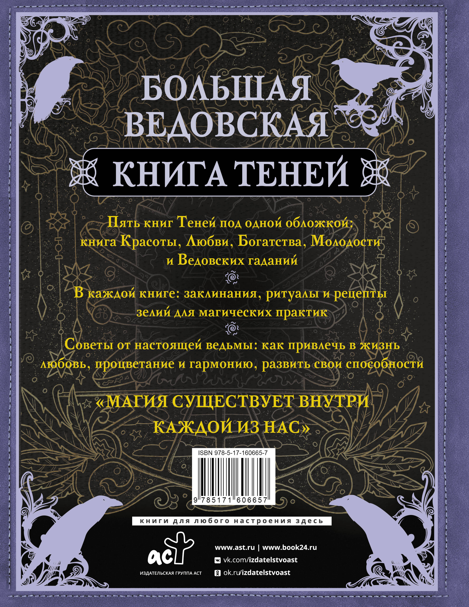 "Ведьмы замечают тени. Ведьмы считают тени. Ведьмы вглядываются в тени. Ведь в них таится Магия". Это - Книга теней. Она научит тебя быть ведьмой. Многие женщины стремятся прикоснуться к магии, не подозревая, что она уже живет внутри них. Некоторые всерьез считают, что существует "школа ведьм", но это неправда. Ведьмы иногда делятся друг с другом своими секретами, но каждая из них учится лишь у себя самой. А точнее - у своей тени. В твоих руках настоящий гримуар, созданный ведьмой-практиком. Под его обложкой собраны пять книг о пяти тенях, которые отбрасывают самые важные стороны нашей жизни: красота, любовь, богатство, долголетие, знание прошлого и будущего. В каждой книге ты найдешь ритуалы, заклинания и рецепты зелий, посвященные одной из тем. Используй их в своей колдовской практике, чтобы развить внутренние способности. Научись направлять энергию на исполнение желаний - на то, чтобы стать счастливой, привлекательной и успешной. Яркая обложка и цветное издание сделают книгу идеальным подарком для опытных и начинающих ведьм, а также для тех, кто хочет добавить немного магии в свою повседневную жизнь.| Издательство | Издательство "АСТ" |