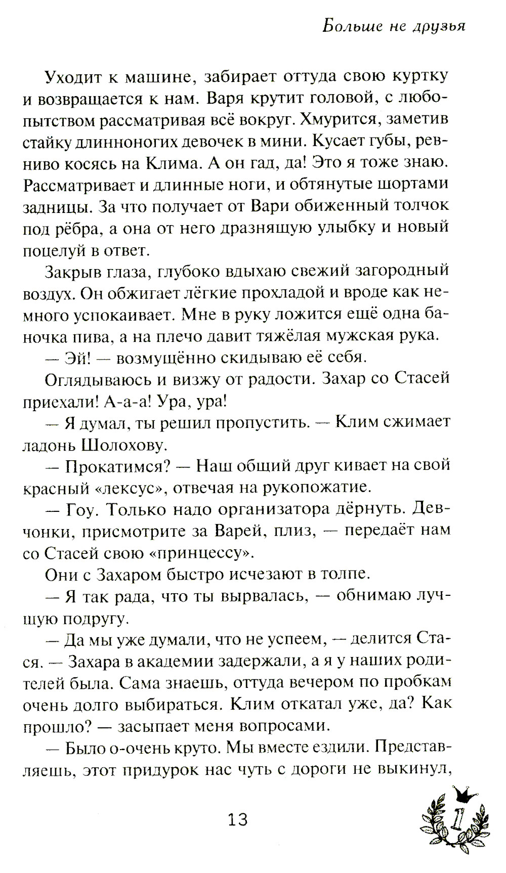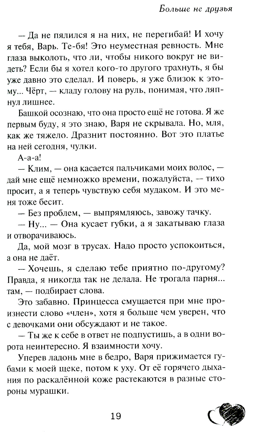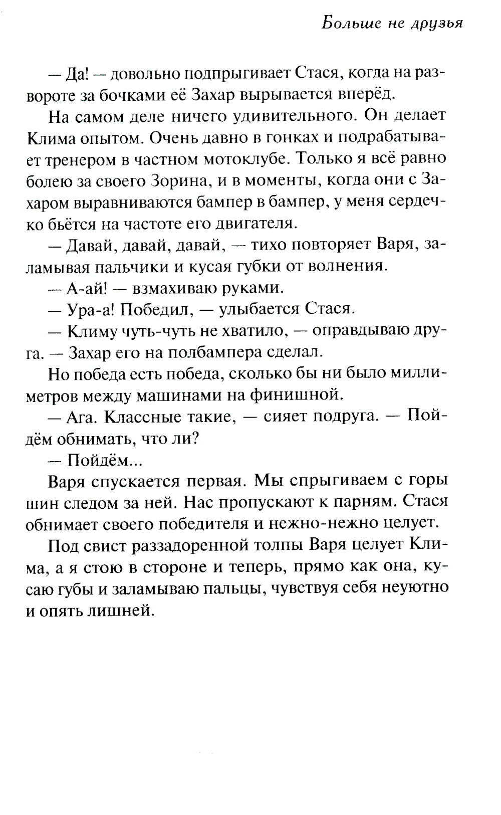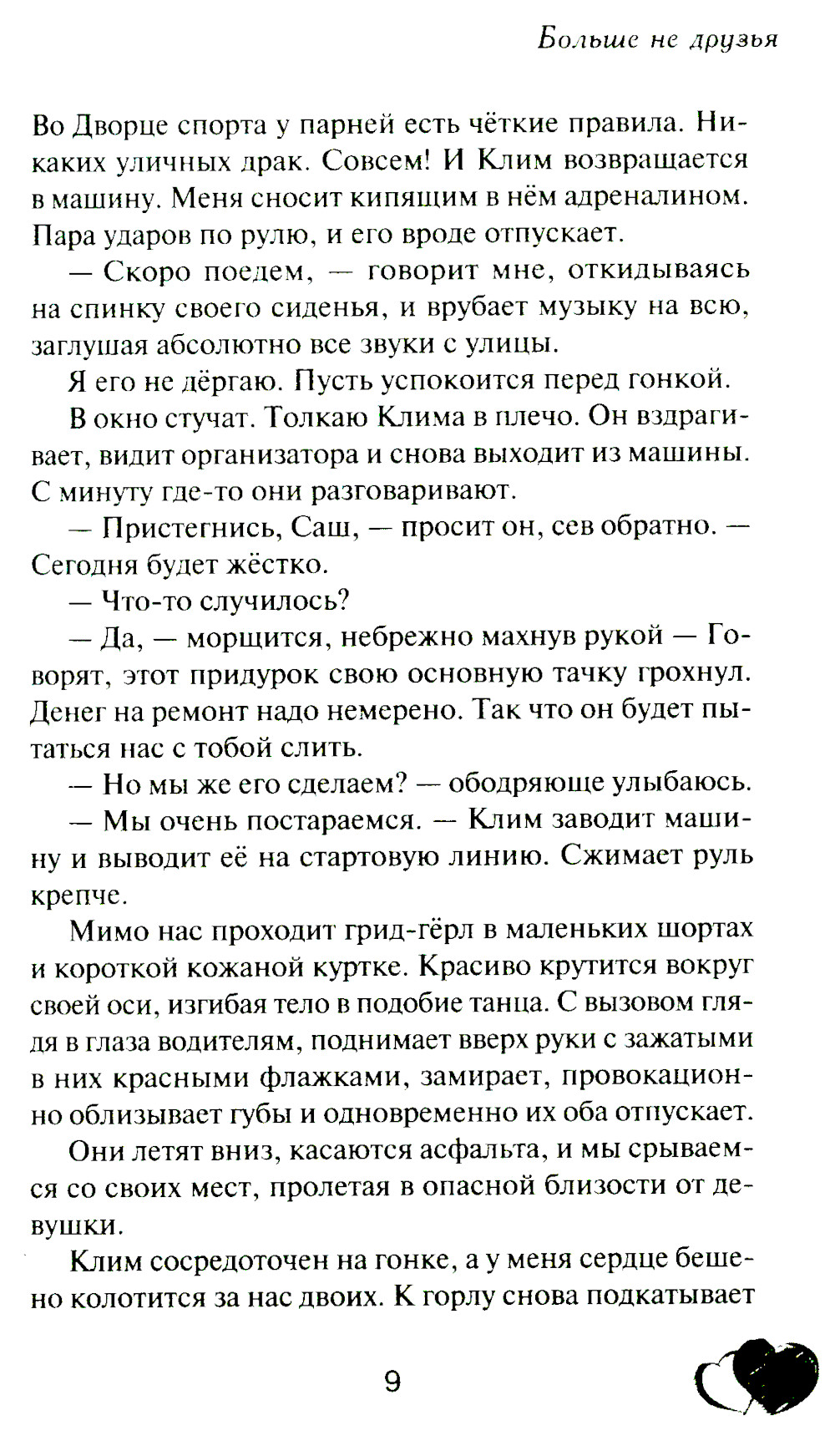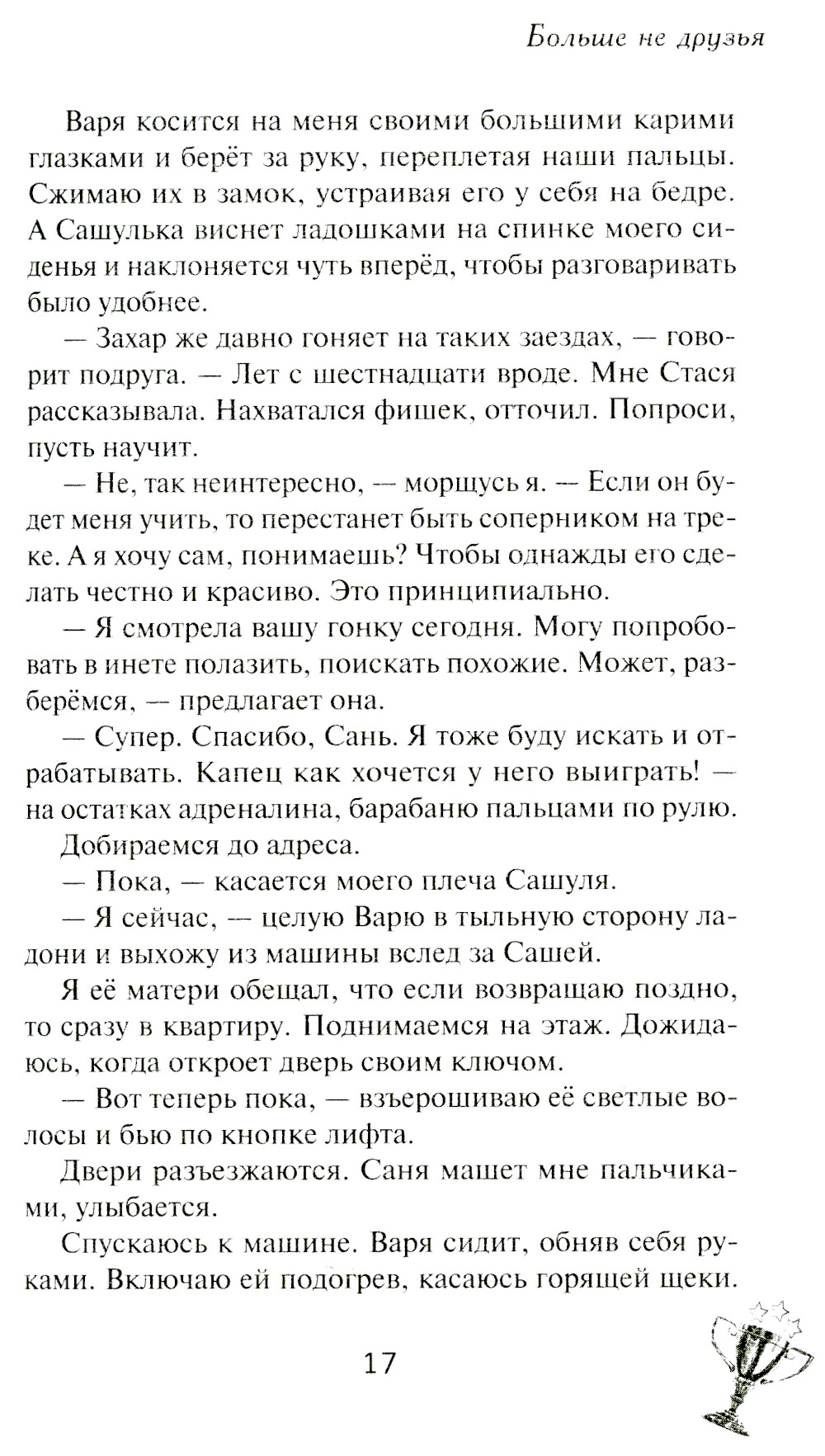 «Больше не друзья» -молодежный роман о спорте и любви от Агнии Арро, автора покорившего читателей удивительной историей о чувствах, гонках, драйве и боксе! Самые близкие и одновременно далёкие. Девочка в рваных джинсах и боксер с голубыми глазами. У него есть девушка, а у неё - только он. Она никогда не расскажет ему о чувствах. Он придет за ними сам. Один безумный поцелуй. Одна ночь вместе. А утром чувство вины в его родных глазах... Кто они теперь друг другу? Это конец? Или все же есть шанс на что-то большее. Придется по душе всем поклонникам романов «Подкати ко мне нежно» Робин Карли, «Соблазн» Мари Мур, Грейс Райли «Один на один». Иллюстрацию на обложку рисовала популярная отечественная художница Кира Мори.