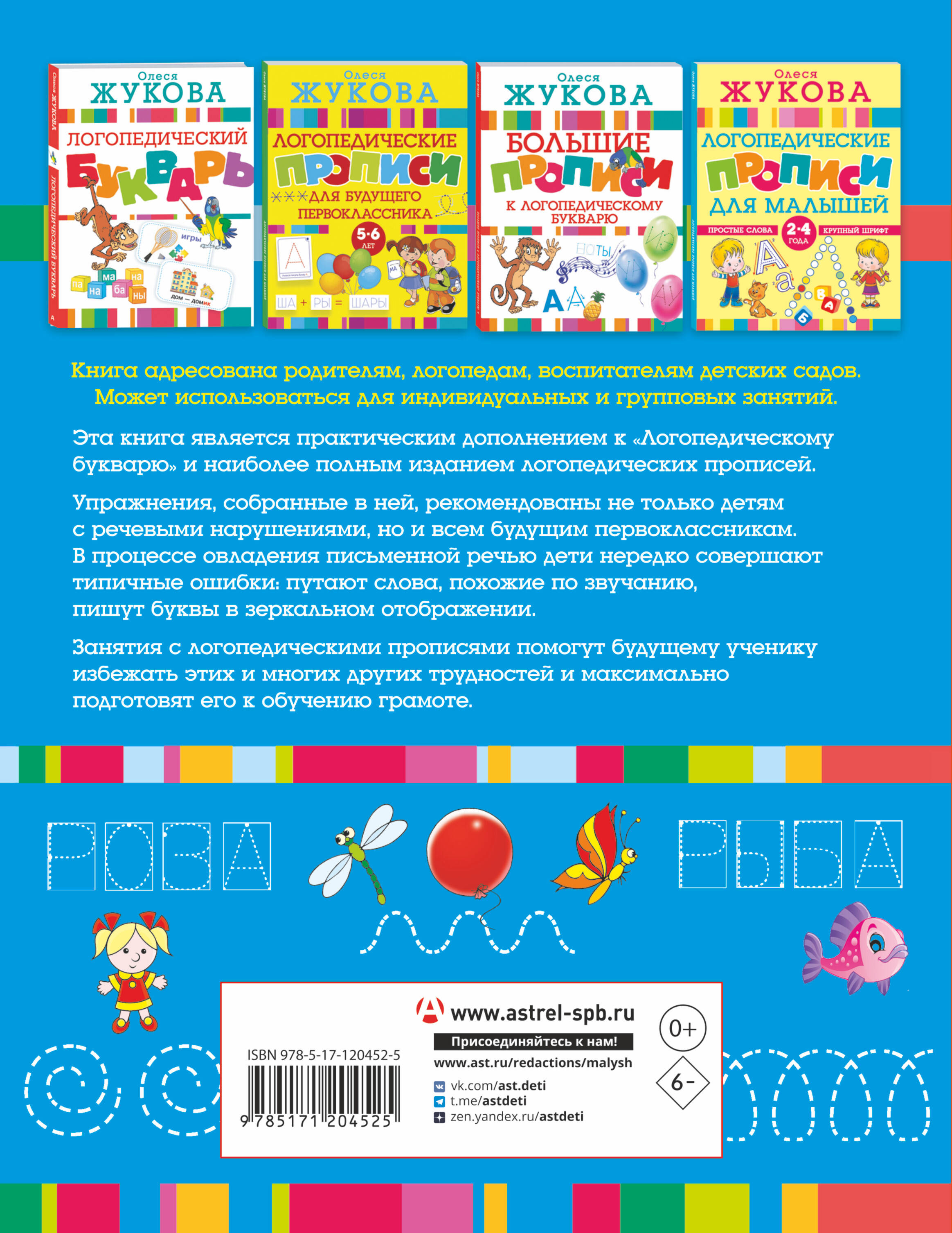 В процессе овладения письменной речью, дети нередко совершают типичные ошибки: путают слова похожие по звучанию, пишут буквы в зеркальном отображении. Занятия с логопедическими прописями помогут будущему ученику избежать этих и многих других трудностей и максимально подготовят его к обучению грамоте. Выполняя задания, ваш малыш закрепит знание алфавита, научится писать слоги, слова и простые предложения, разовьет речь и обогатит словарный запас. Для дошкольного возраста.| Издательство | ИЗДАТЕЛЬСТВО "АСТ" |