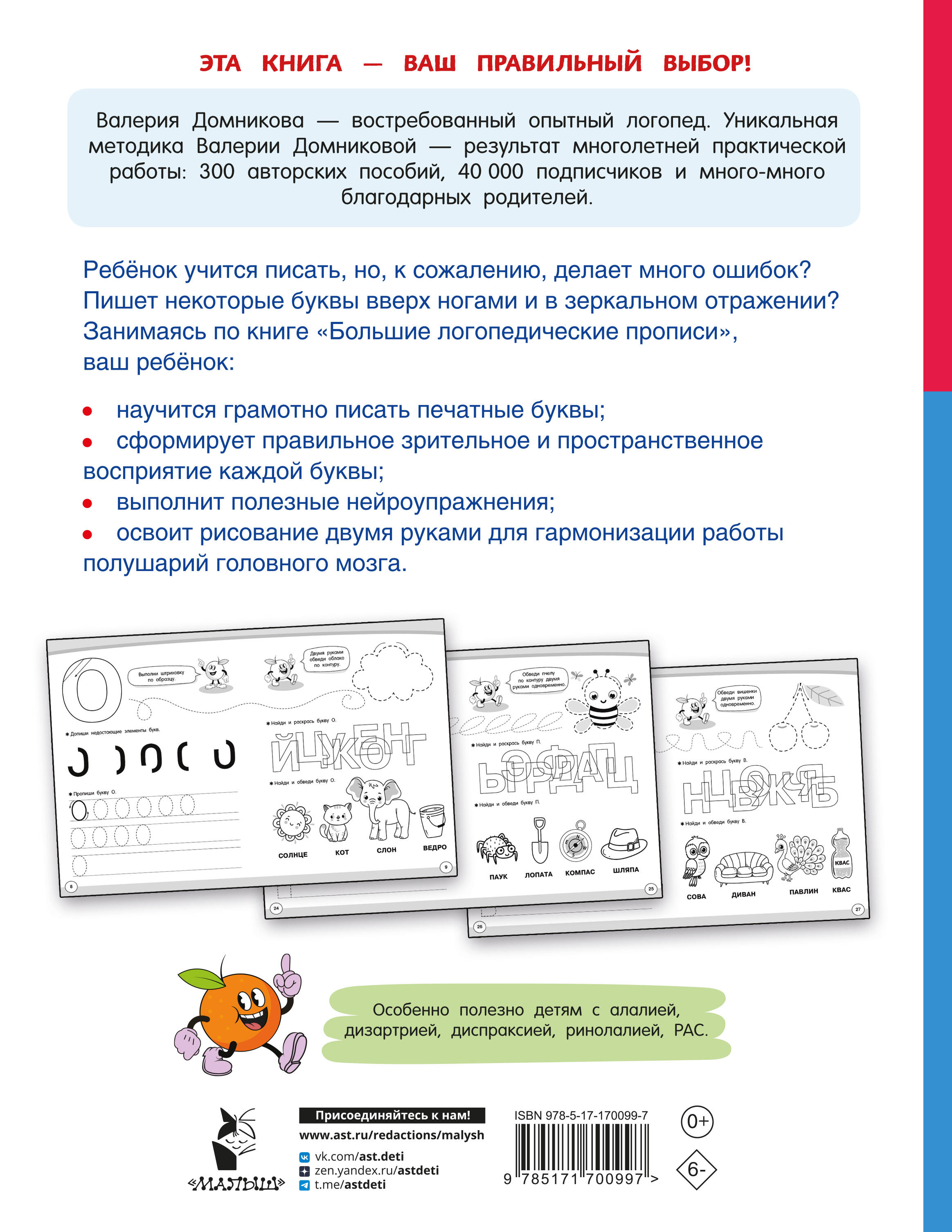 Ребёнку пора учиться писать, но, к сожалению, у него есть проблемы с речью? Или малыш пишет некоторые буквы вверх ногами и в зеркальном отражении? Пропускает буквы при написании слова? Путает парные согласные? Тогда вам нужна новая серия книг от АСТ «Вам поможет логопед». «Большие логопедические прописи» разработаны опытным логопедом-практиком Валерией Домниковой, автором более 300 логопедических пособий. Ребёнок не только научится писать печатные буквы, но и освоит штриховку, отработает специальные синхронные и асинхронные движения для гармонизации работы полушарий головного мозга (такие движения выполняются одновременно двумя руками), а также сформирует правильное зрительное и пространственное восприятие каждой буквы. Зеркальное написание букв, которое часто называют «почерком Леонардо да Винчи», - больше не проблема! Прописи будут особенно полезны детям с алалией, дизартрией, диспраксией, ринолалией, РАС и другими нарушениями речи. Учите ребёнка писать правильно, используйте проверенную методику. Подарите малышу уверенность в себе! В комплекте с «Большими логопедическими прописями» советуем вам приобрести «Логопедическую азбуку».| Издательство | Издательство "АСТ" |