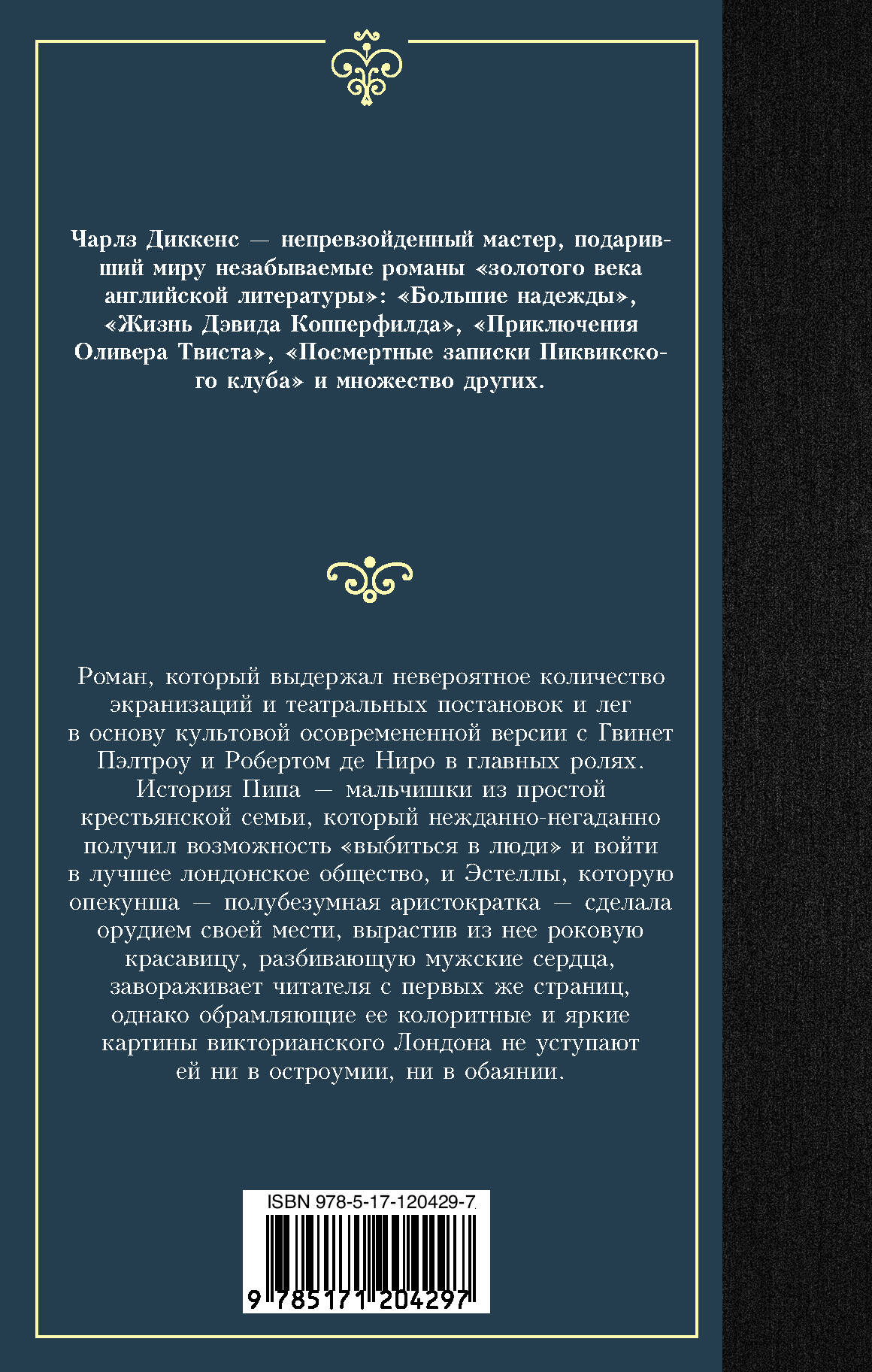 Роман, который выдержал невероятное количество экранизаций и театральных постановок и лег в основу культовой осовремененной версии с Гвинет Пэлтроу и Робертом де Ниро в главных ролях. История Пипа - мальчишки из простой крестьянской семьи, который нежданно-негаданно получил возможность «выбиться в люди» и войти в лучшее лондонское общество, и Эстеллы, которую опекунша - полубезумная аристократка - сделала орудием своей мести, вырастив из нее роковую красавицу, разбивающую мужские сердца, завораживает читателя с первых же страниц, однако обрамляющие ее колоритные и яркие картины викторианского Лондона не уступают ей ни в остроумии, ни в обаянии.