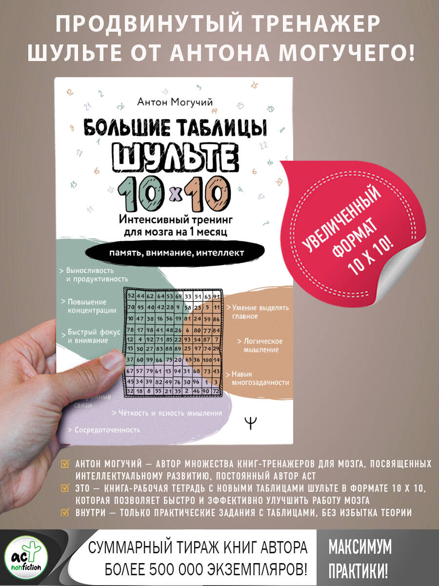 Развивайте интеллект, внимание и память еще быстрее с инновационной системой тренировок Антона Могучего, направленной на улучшение работы мозга, внимания и памяти! Увеличенный размер "таблиц Шульте" 10 х 10 открывает новые возможности для интеллектуального роста на продвинутом уровне и делает тренировки в два раза более эффективными. Ощутите, как ваш мозг работает на максимум уже после первых занятий! С помощью этого тренажера вы сможете повысить работоспособность, укрепить память и даже развить логическое мышление! Вы также научитесь работать в режиме многозадачности, быстро переключаться между делами, оперативно принимать решения и управлять своим вниманием. Прокачайте ваш мозг на максимум! Этот тренажер поможет вам: · стать сосредоточенным и внимательным; · повысить скорость мышления; · улучшить память; · оставаться выносливым и продуктивным на протяжении длительного времени. Книга-рабочая тетрадь в мягкой обложке.| Издательство | Издательство "АСТ" |