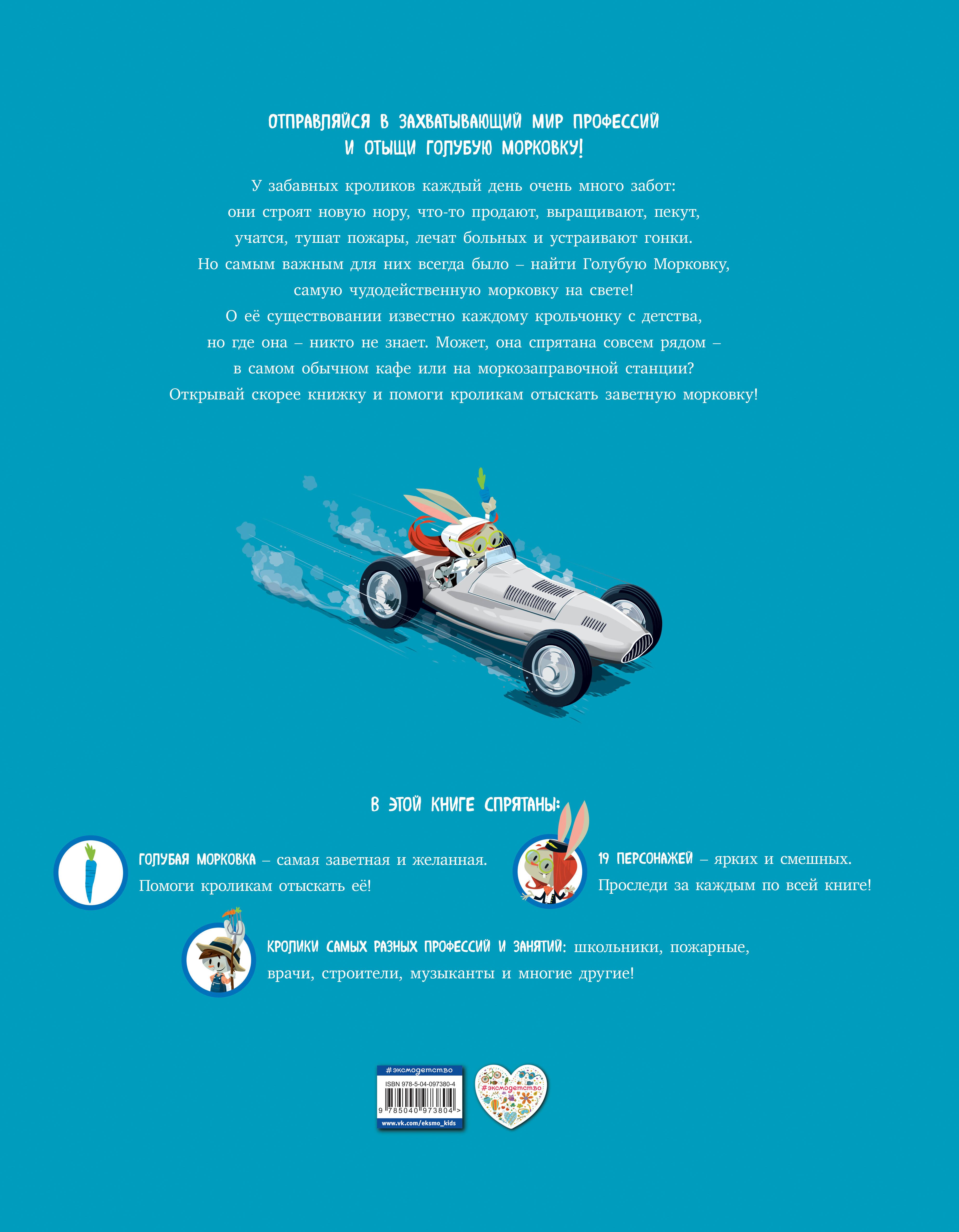 Отправляйся в захватывающий мир профессий и отыщи Голубую Морковку! У забавных кроликов каждый день очень много забот: они строят новую нору, что-то продают, выращивают, пекут, учатся, тушат пожары, лечат больных и устраивают гонки. Но самым важным для них всегда было - найти Голубую Морковку, самую чудодейственную морковку на свете! О ее существовании известно каждому крольчонку с детства, но где она - никто не знает. Может, она спрятана совсем рядом - в самом обычном кафе или на моркозаправочной станции? Открывай скорее книжку и помоги кроликам отыскать заветную морковку! В этой книге спрятаны: - Голубая Морковка - самая заветная и желанная. Помоги кроликам отыскать ее! - 19 персонажей - ярких и смешных. Проследи за каждым по всей книге! - Кролики самых разных профессий и занятий: школьники, пожарные, врачи, строители, музыканты и многие другие!| Издательство | ООО "Издательство "Эксмо" |