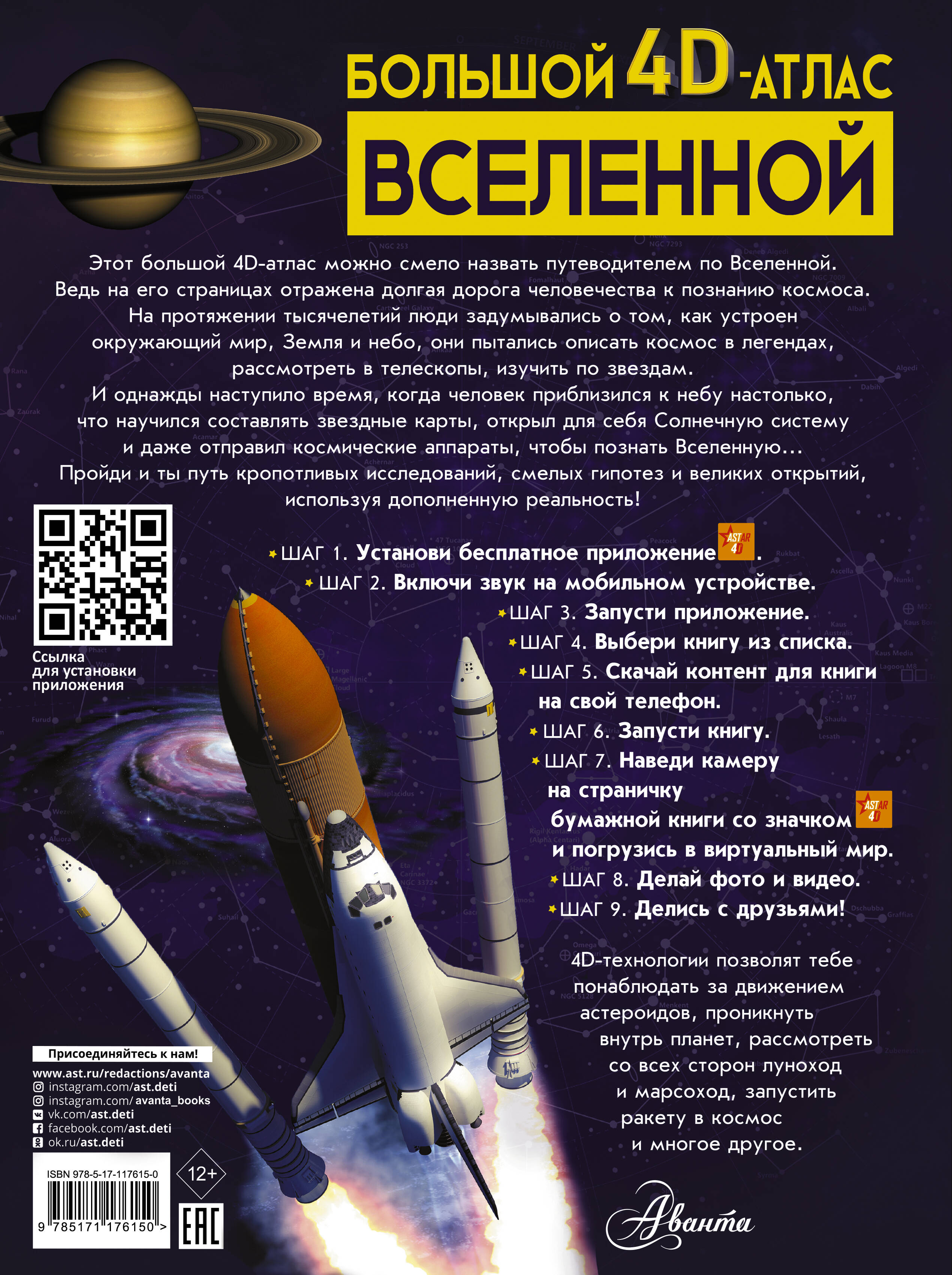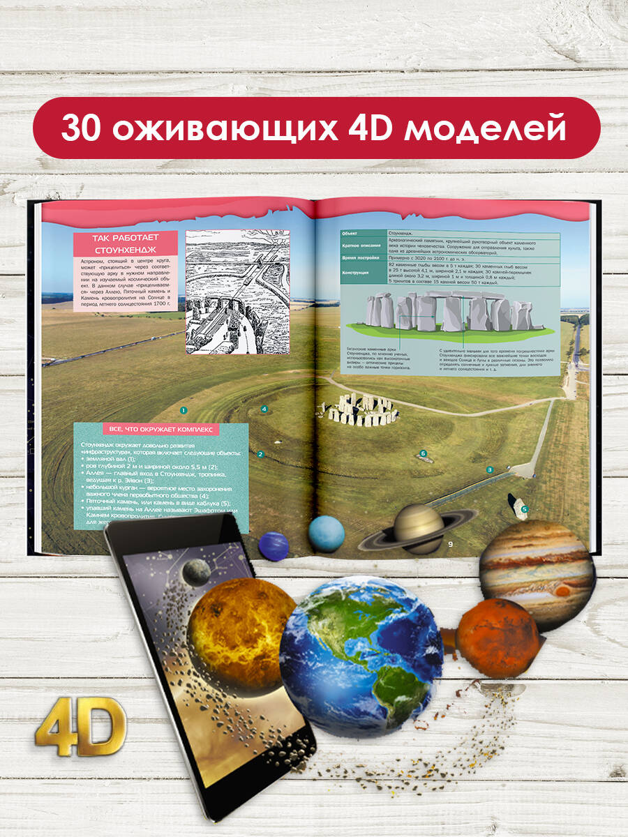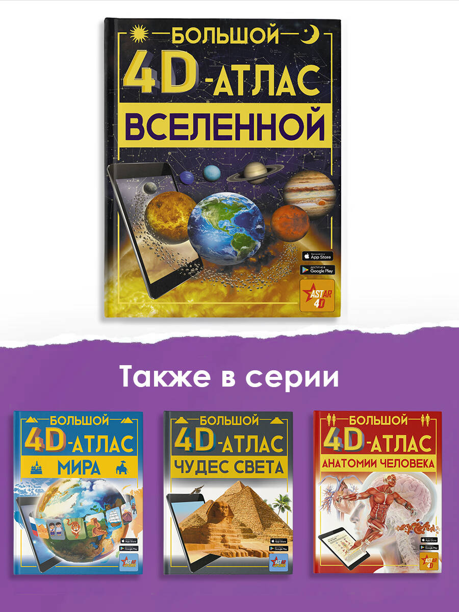 Большой 4D-атлас Вселенной с дополненной реальностью рассказывает о космосе и истории его изучения, начиная от первых попыток человека составить звездные карты и заканчивая современными теориями о поглотителях времени - черных дырах. А новейшие 4D-технологии совершенно меняют восприятие прочитанного, позволяя изучать Вселенную в интерактивном режиме. Запустить ракету, разложить планету на слои, понаблюдать за падением астероида, заглянуть внутрь лунохода - это и многое другое можно рассмотреть в объеме, движении и различном масштабе. Дополненная реальность, звуковые эффекты и нестандартно изложенная познавательная информация привлекут внимание читателей любого возраста. Для среднего и старшего школьного возраста.| Издательство | ИЗДАТЕЛЬСТВО "АСТ" |