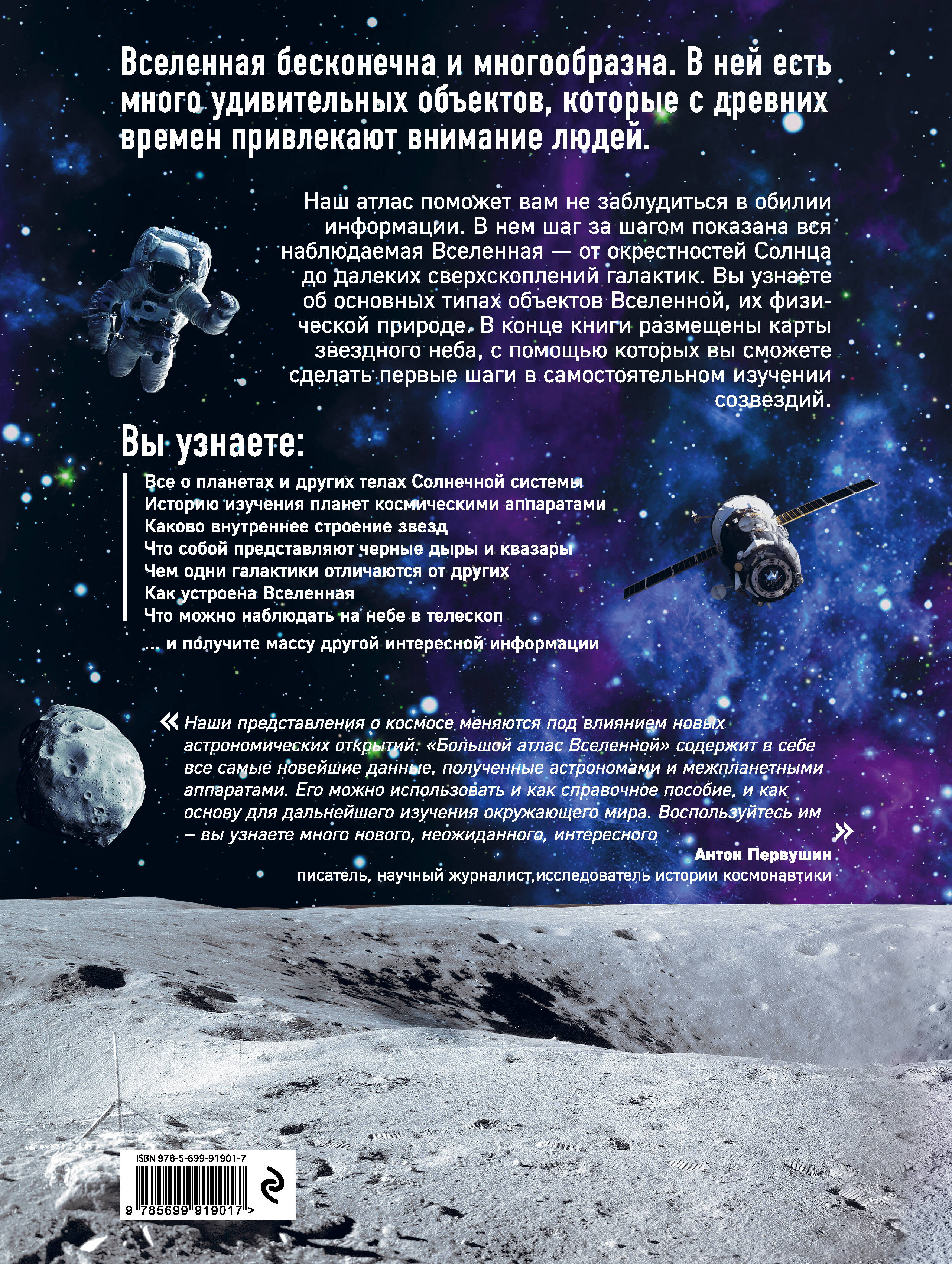 Вселенная бесконечна и многообразна. В ней есть много удивительных объектов, которые с древних времен привлекают внимание людей. Наш атлас поможет вам не заблудиться в обилии информации. В нем шаг за шагом показана вся наблюдаемая Вселенная - от окрестностей Солнца до далеких сверхскоплений галактик. Вы узнаете об основных типах объектов Вселенной, их физической природе. В конце книги размещены карты звездного неба, с помощью которых вы сможете сделать первые шаги в самостоятельном изучении созвездий. Вы узнаете: * Всё о планетах и других телах Солнечной системы. * Историю изучения планет космическими аппаратами. * Каково внутреннее строение звезд. * Что собой представляют черные дыры и квазары. * Чем одни галактики отличаются от других. * Как устроена Вселенная. * Что можно наблюдать на небе в телескоп. ...И получите массу другой интересной информации.| Издательство | ООО "Издательство "Эксмо" |