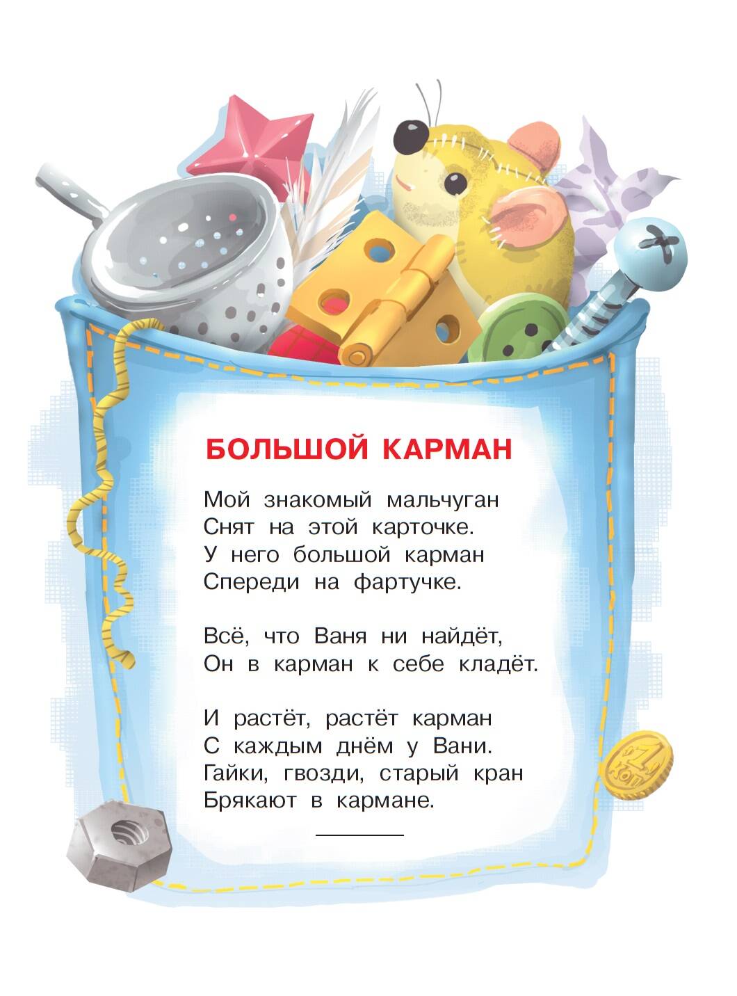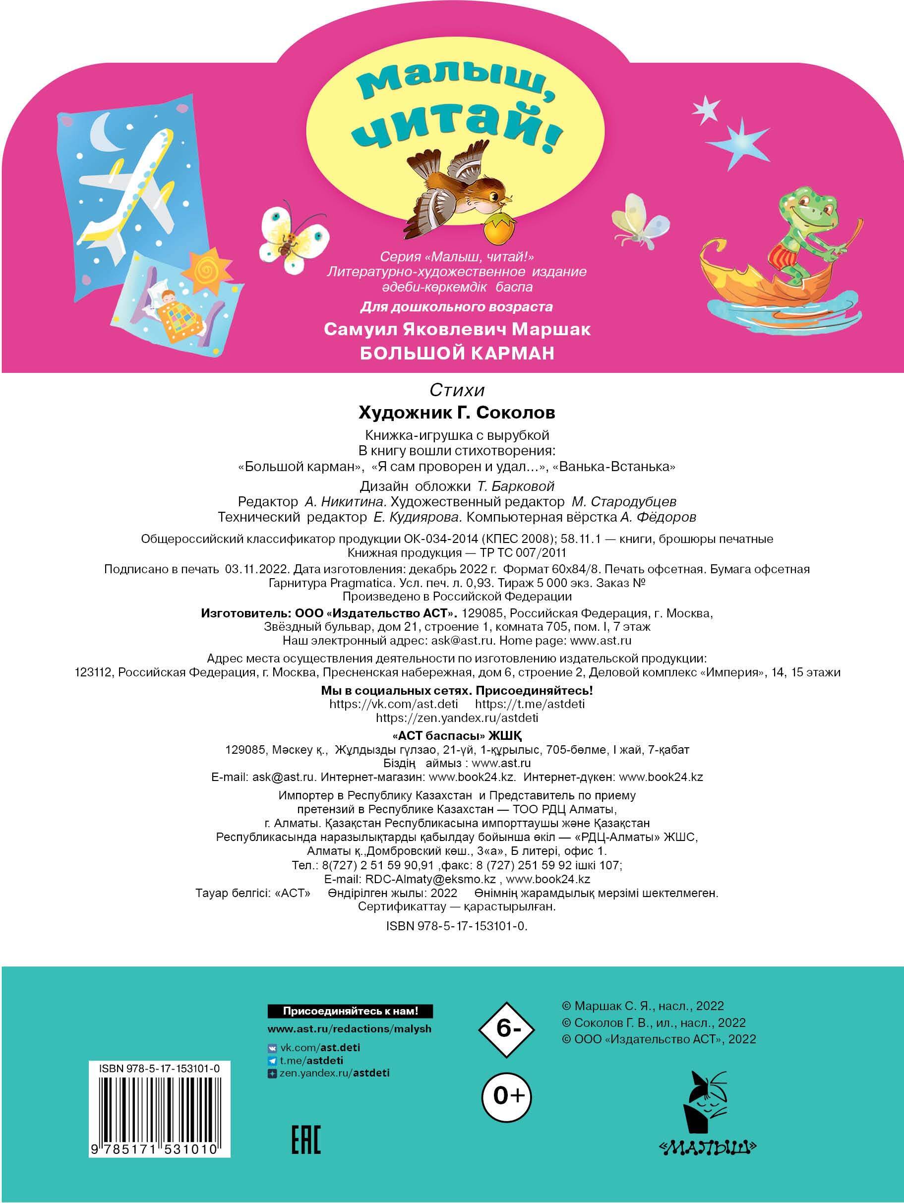 "Большой карман" С. Маршака - новая книга серии "Малыш, читай!" Эта серия предназначена для самых маленьких читателей, которым ещё тяжело самочтоятельно читать большие тексты. В серии книги подобраны с учётом возрастных особенностей ребёнка. Они станут первым помощником на пути в большой мир литературы.| Издательство | ИЗДАТЕЛЬСТВО "АСТ" |