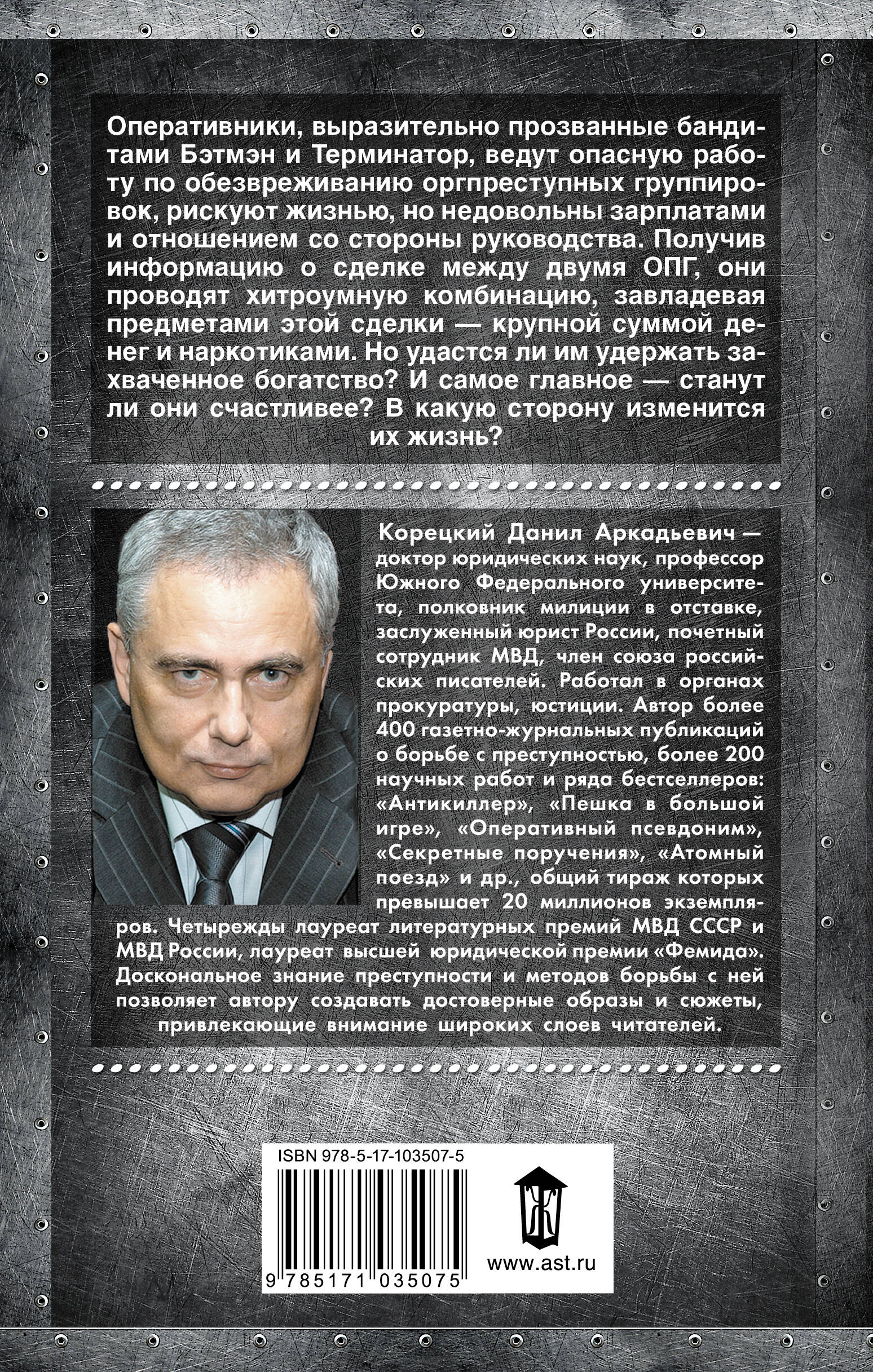 Оперативники, выразительно прозванные бандитами Бэтмэн и Терминатор, ведут опасную работу по обезвреживанию оргпреступных группировок, рискуют жизнью, но недовольны зарплатами и отношением со стороны руководства. Получив информацию о сделке между двумя ОПГ, они проводят хитроумную комбинацию, завладевая предметами этой сделки - крупной суммой денег и наркотиками. Но удастся ли им удержать захваченное богатство? И самое главное - станут ли они счастливее? В какую сторону изменится их жизнь?| Издательство | Издательство "АСТ" |