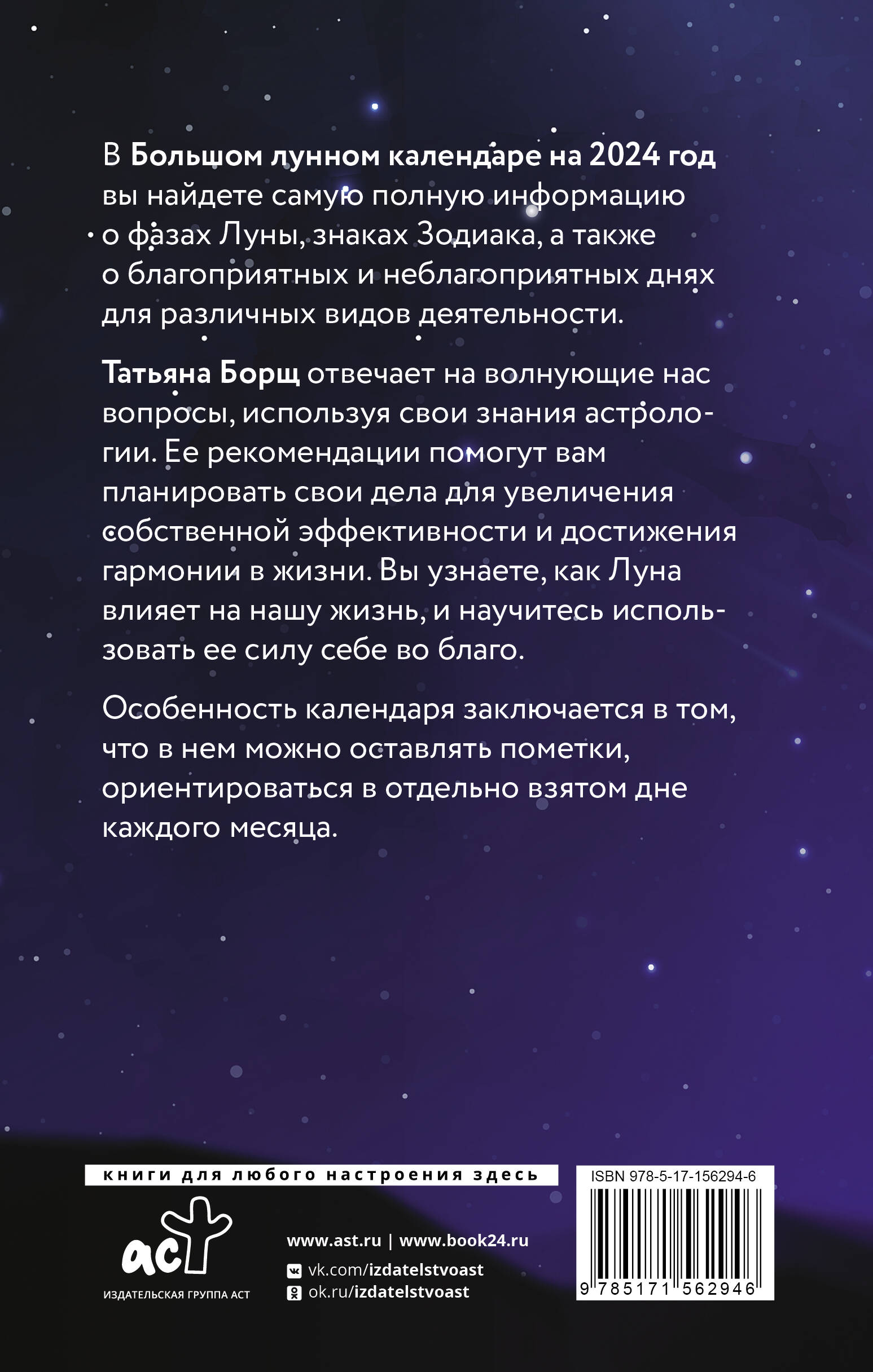 В Большом лунном календаре на 2024 год вы найдете самую полную информацию о фазах Луны, знаках Зодиака, а также о благоприятных и неблагоприятных днях для различных видов деятельности. Татьяна Борщ отвечает на волнующие нас вопросы, используя свои знания астрологии. Ее рекомендации помогут вам планировать свои дела для увеличения собственной эффективности и достижения гармонии в жизни. Вы узнаете, как Луна влияет на нашу жизнь, и научитесь использовать ее силу себе во благо. Особенность календаря заключается в том, что в нем можно оставлять пометки, ориентироваться в отдельно взятом дне каждого месяца.| Издательство | ИЗДАТЕЛЬСТВО "АСТ" |